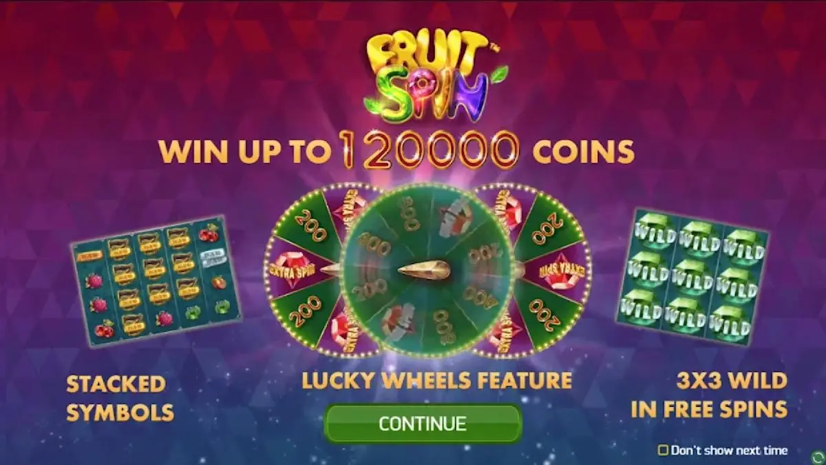 settingFruit Spin is rich in visual style and simplicity, but it doesn’t fall short on features. The key bonus feature is the Lucky Wheels, which is activated when a portion of the 3×3 Scatter symbol lands on the reels. This interactive feature allows players to spin up to three wheels that contain coin wins and segments of the Free Spins symbol. Collecting three symbols unlocks the Free Spins round, during which colossal 3×3 Wilds are introduced, significantly improving your chances of landing big payouts. The game also includes stacked symbols and the occasional 3×3 mega symbols in the base game, keeping each spin exciting. While there is no progressive jackpot or gamble round, the sheer power of the oversized symbols and the simplicity of the mechanics keep players engaged. The medium volatility ensures frequent bonus triggers, and autoplay, turbo mode, and mobile optimization offer a smooth experience across all platforms.