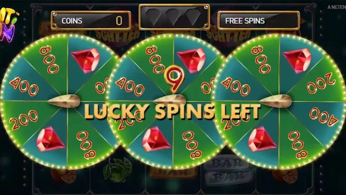 Fruit Spin Slot Free SpinsThe Free Spins round in Fruit Spin is accessed via the Lucky Wheels bonus feature. When the large 3×3 Scatter symbol appears partially on the reels, it triggers a wheel-based bonus game. Players spin up to three wheels, with each wheel offering either coin wins or a segment of the Free Spins icon. Collecting three Free Spins icons from the wheels awards five free spins, launching the game’s most rewarding mode.