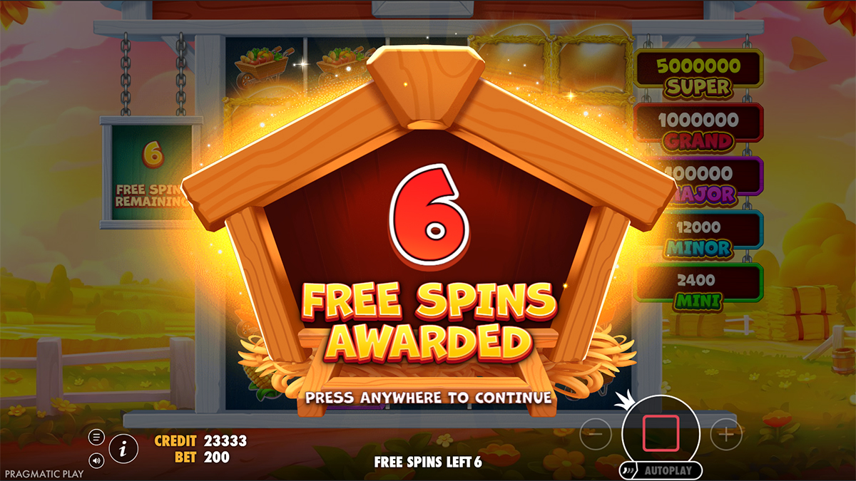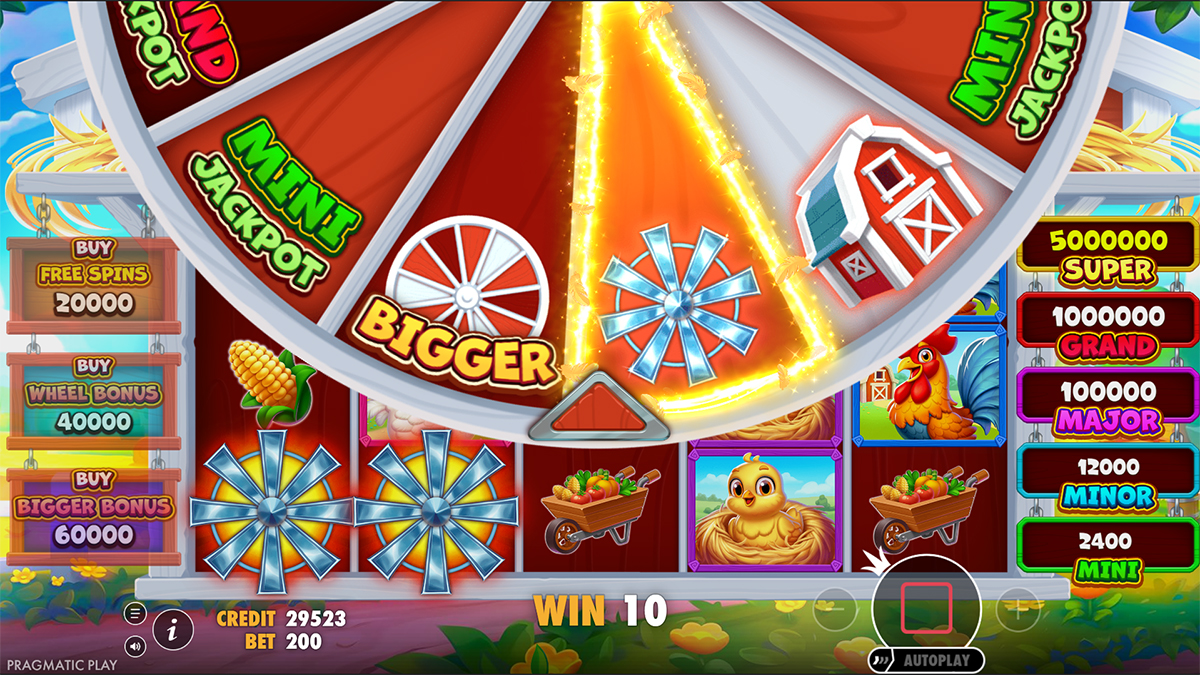 Mechanically, the slot is built around high volatility, offering large potential wins balanced against periods of lower activity. The hit frequency of 27.4% means that players can expect regular smaller wins, but the true excitement comes from unlocking Free Spins or activating the Bonus Wheel, where jackpots and multipliers await. Pragmatic Play has also included Feature Buy options, allowing players to bypass waiting for triggers and dive straight into their favorite bonus rounds. The clever integration of Scatter Symbols creating progressive upgrades during Free Spins, combined with the potential of unlocking a Bigger Bonus Wheel, makes the slot feel both strategic and highly rewarding. Every mechanic is designed to push toward the massive 25,000x max win, which sets this game apart from typical farm-themed slots.