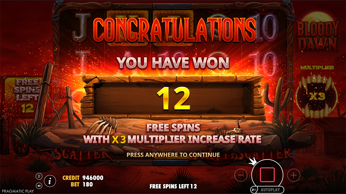 Bloody Dawn ScatterThe free spins round in Bloody Dawn is triggered by landing between 3 and 10 Scatters anywhere on the reels, awarding 12 spins accompanied by a starting multiplier that scales from x1 to x8 depending on the number of Scatters collected. Once activated, the feature transforms the game into a volatile battleground where multipliers never reset, and every tumble builds momentum by increasing the multiplier further based on the initially granted value. The bonus escalates even more dramatically when additional batches of 3 to 10 Scatters appear, granting 6 extra spins and enhancing the incremental multiplier growth by up to 9x, all while guaranteeing that every symbol on the middle reel becomes a Gold Symbol, greatly boosting the potential for powerful, cascading wins.