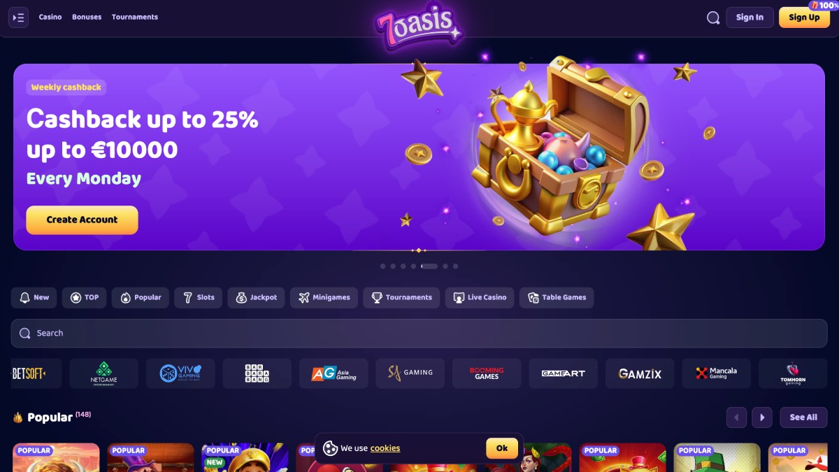 7oasis Casino offers a comprehensive and engaging gaming experience, combining an extensive collection of around 1,000 slots with a variety of table games and a live dealer section. Gamers can take advantage of generous bonuses, including a welcome pack with up to 5,000 EUR and 555 free spins, as well as themed weekly promotions catering to both casual and high-stakes gamers. The platform partners with reputable software providers such as Hacksaw Gaming, Yggdrasil, Play’n GO, and Push Gaming, ensuring high-quality gameplay and innovative features.