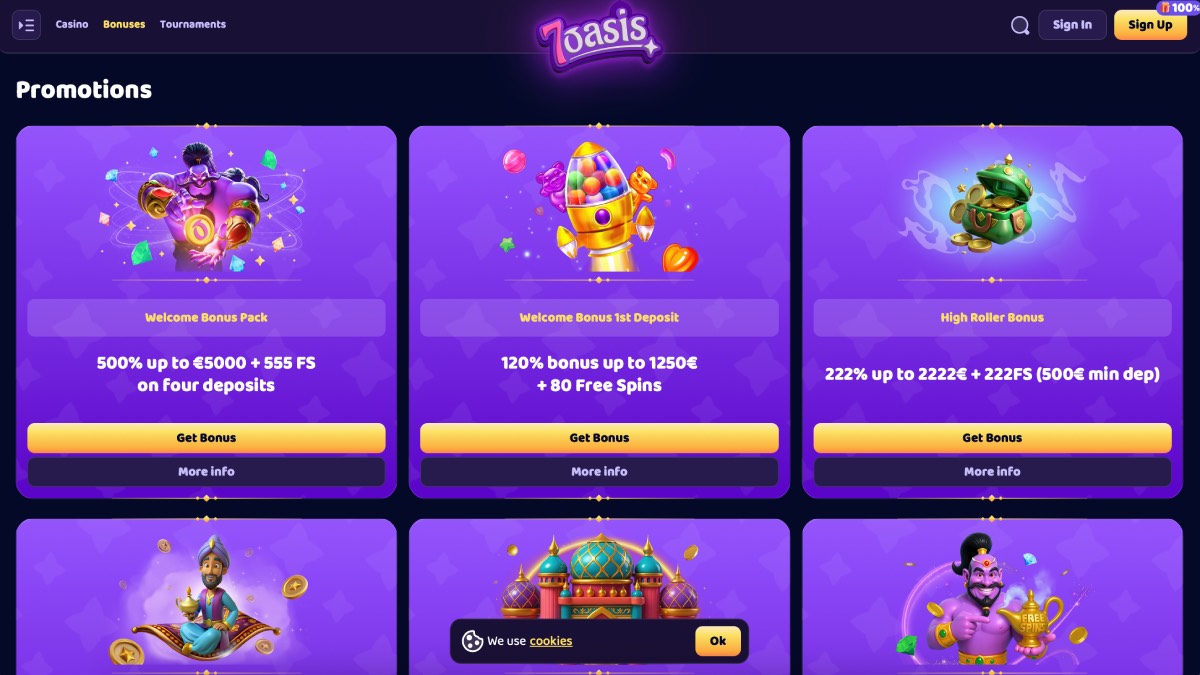 7oasis Casino offers an extensive range of bonuses and promotions designed to appeal to both new and regular players. The welcome bonus pack is particularly generous, providing up to 500% bonus up to 5,000 EUR along with 555 free spins across the first four deposits, all subject to a 40x wagering requirement. The first deposit bonus gives 120% up to 1,250 EUR plus 80 free spins, also with a 40x wagering requirement. High rollers can take advantage of a 222% bonus up to 2,222 EUR and 222 free spins, requiring a minimum deposit of 500 EUR and a 40x wagering condition. For regular players, the casino features themed weekly promotions: Monday’s Aliba Bonus offers 111% up to 500 EUR plus 111 free spins; Wednesday’s Oriental Tale gives 40% up to 1,000 EUR and 40 free spins; Friday Spins from Genie delivers 50 free spins with a 40x wagering requirement; Precious Saturday provides 75% up to 750 EUR plus 75 free spins; and Sunday Royal Reset offers 50% up to 550 EUR along with 50 free spins.