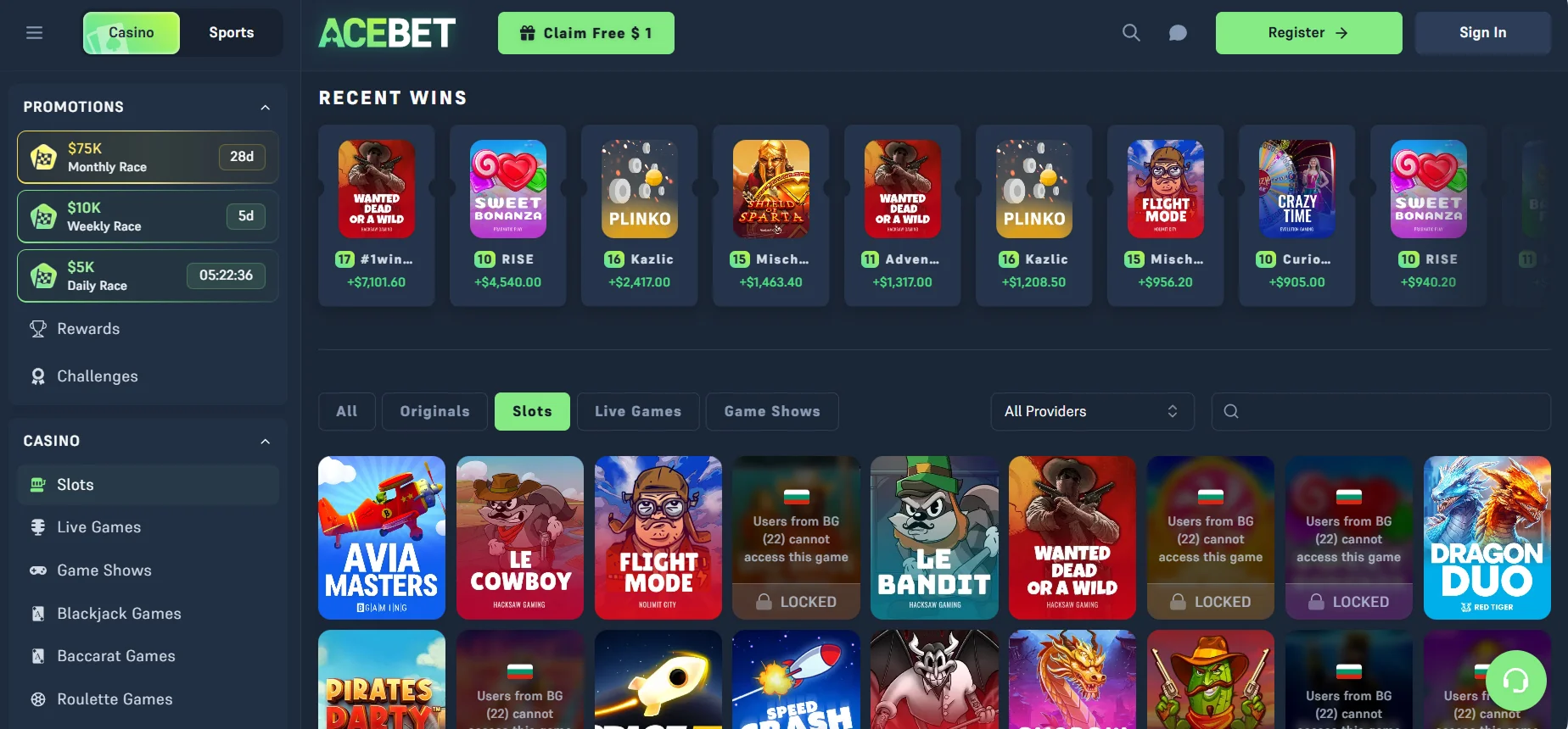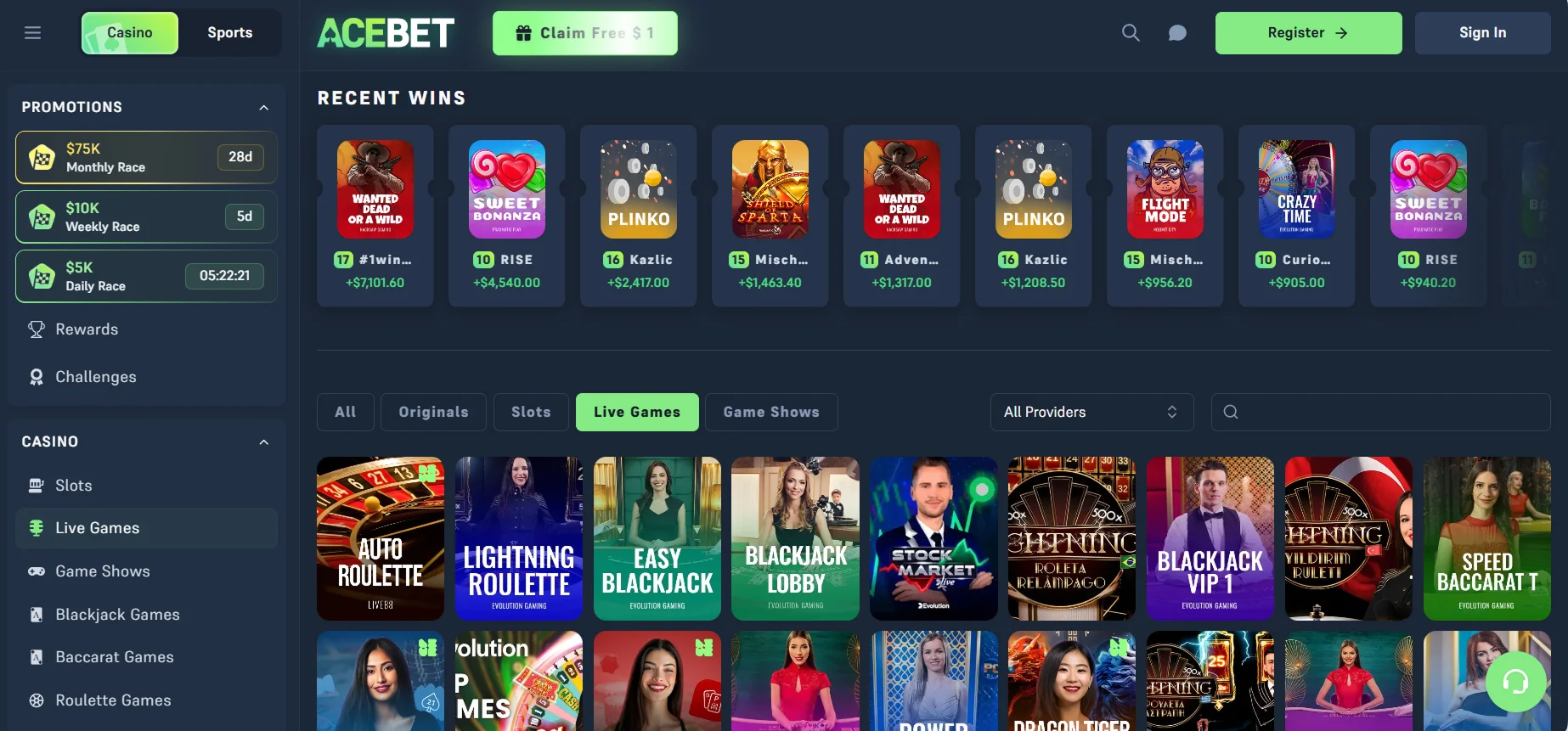 Acebet Casino maintains a library of around 2,000 games supplied by ten established providers. The lobby divides titles into clear sections for slots, live tables, blackjack, baccarat, roulette, and an Originals category for in-house games. Filters allow sorting by provider or game type, and the sportsbook sits alongside the casino offerings under the same account. The current count leans toward quality over volume, with room for growth as the platform matures.