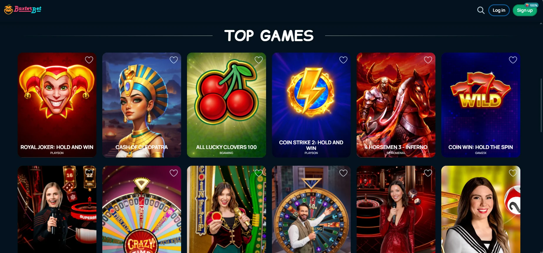 BaxterBet Casino stocks over 6,000 slots, plus table staples and 100+ live dealer setups. Slots dominate with progressives and classics from NetEnt and Pragmatic Play, while tables include blackjack and roulette variants. Live options from Evolution cover baccarat and shows, all filtered by provider or type for targeted searches.