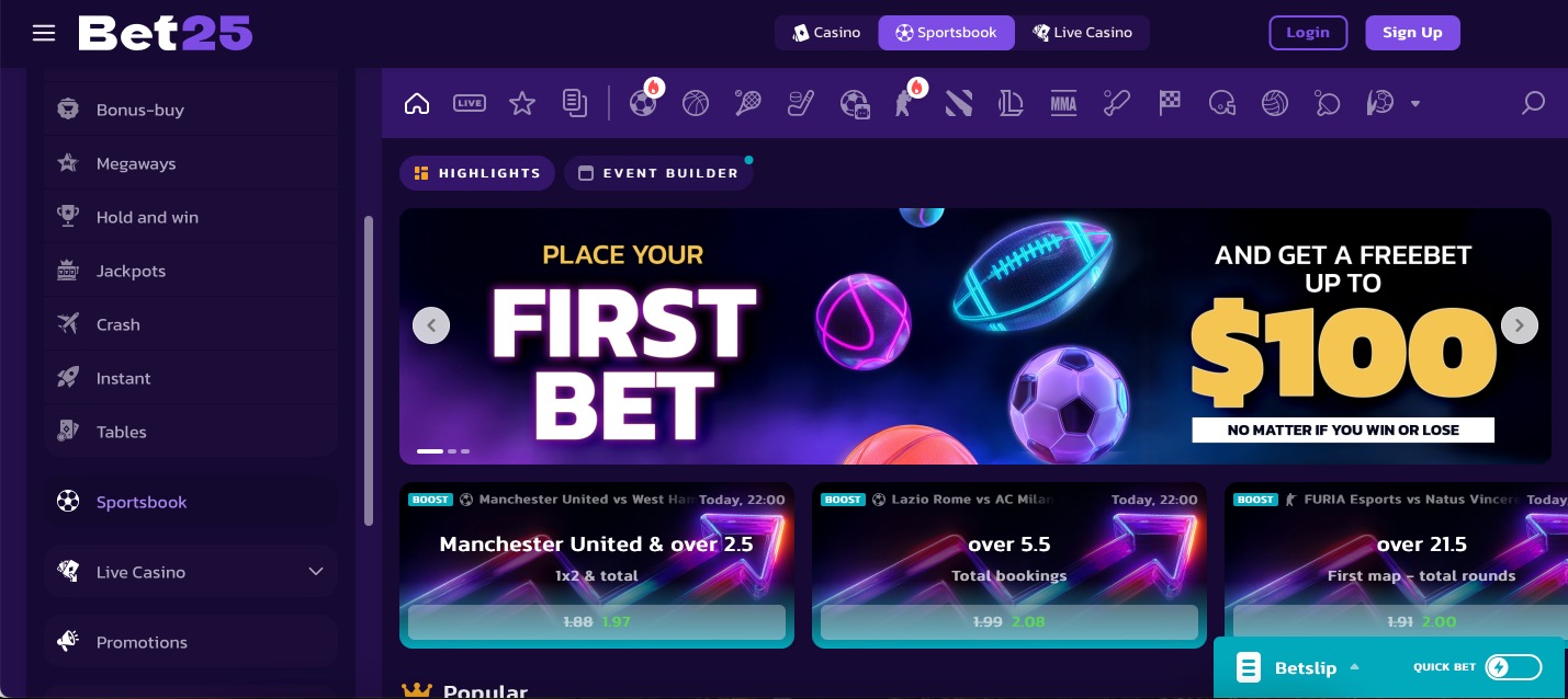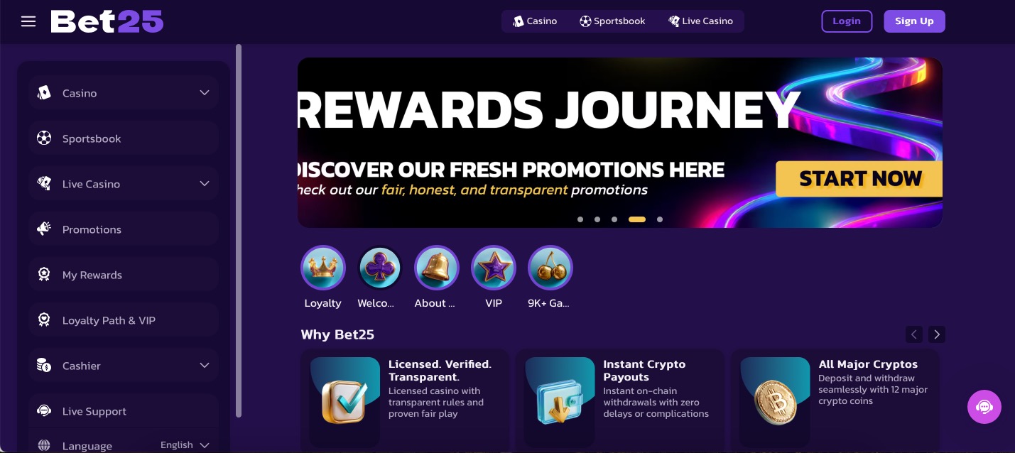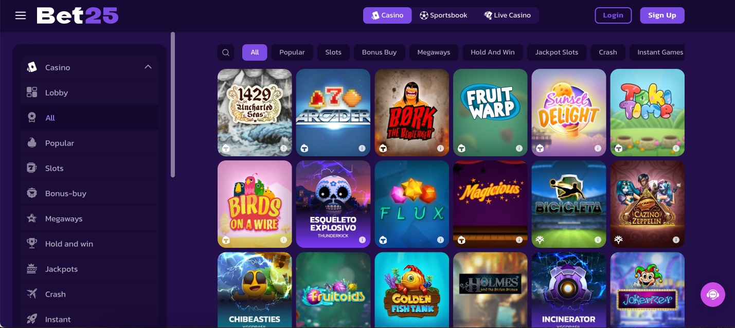 Bet25 Casino operates as a cryptocurrency-only platform that combines casino games and sports betting on a single site. The library contains more than 8000 titles, with a clear focus on slots, jackpot games, Megaways releases, and titles that include a bonus-buy option. A separate live casino area offers tables from several providers, while the sportsbook covers mainstream leagues and less common markets.