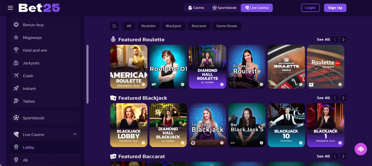 The casino section at Bet25 contains over 8000 games, primarily slots. The catalog includes classic reel layouts, Megaways titles, progressive jackpots, and a large number of games with a bonus-buy mechanic. Table games and video poker are present but in smaller quantities compared to slots. A dedicated live casino lobby hosts several hundred tables covering blackjack, roulette, baccarat, and game-show formats supplied by multiple studios.