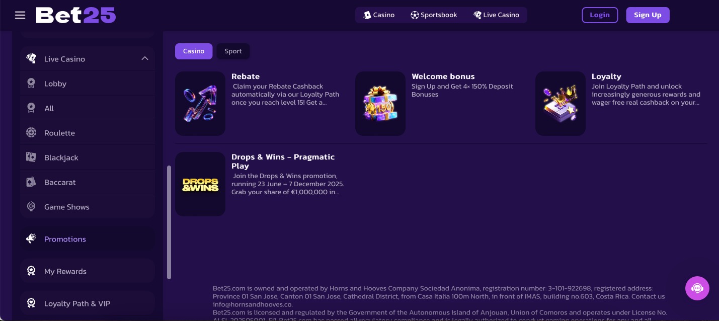 Bet25 Casino holds a valid license from the Government of the Autonomous Island of Anjouan (ALSI-202505001-FI1) and is operated by Horns and Hooves Company Sociedad Anonima. The site uses SSL encryption and works only with established game providers.