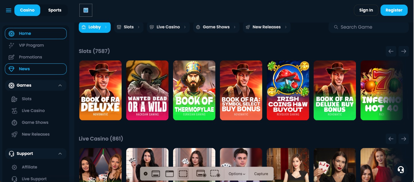 The site offers thousands of titles, with over 7000 slots plus live dealer tables. Providers include Pragmatic Play, NetEnt, and Evolution. A sportsbook is also available.