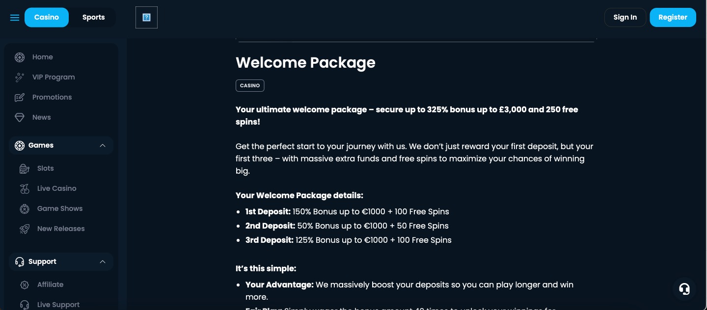 1Interface/GamePlay Interface/GamePlayUser-friendly interface, interactive website, and bonus-based gameplay with generous welcome bonuses to attract new players and keep them interested in the platform. Bonuses allow gamblers to play for longer on their favorite casino games, to enjoy more thrilling betting sessions for free, with free spins and bonus money, and to land smashing real money wins without spending a dime on their side.