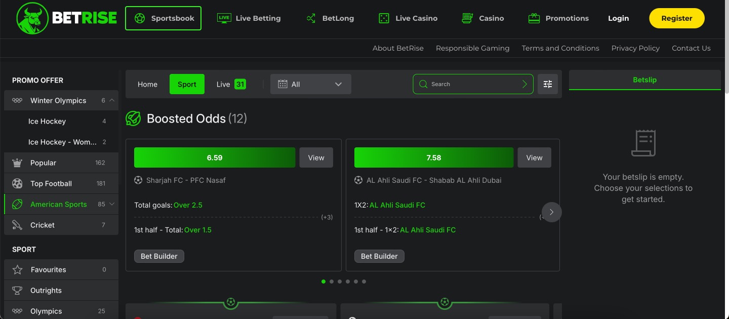 BetRise Casino combines sportsbook action with a full casino floor under one roof. The platform runs a large slots catalog alongside live tables streamed in real time and a modern sports betting section focused heavily on in-play markets. Promotions target both casino players and bettors, with structured welcome offers and recurring weekly deals tied to specific days or events.