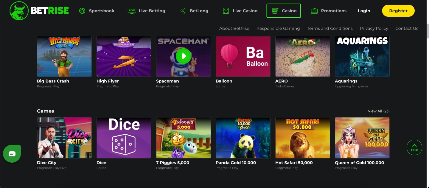 BetRise Casino offers thousands of slots from providers like Pragmatic Play and NetEnt, alongside classic table games such as blackjack and roulette. Live casino features Evolution-powered tables for real-time blackjack, roulette, and game shows. The sportsbook adds sports betting options beyond pure casino play.