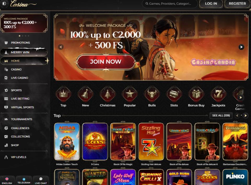 Casina holds more than 8100 slots and over 500 live rooms. The slot hall covers classics, high volatility picks, megaways, feature buys and themed releases. Live play gives real tables with roulette, blackjack, baccarat and show formats. Navigation filters help shorten search time and a search bar supports direct title lookup. This scale suits users who enjoy testing new releases and rotating between styles.
