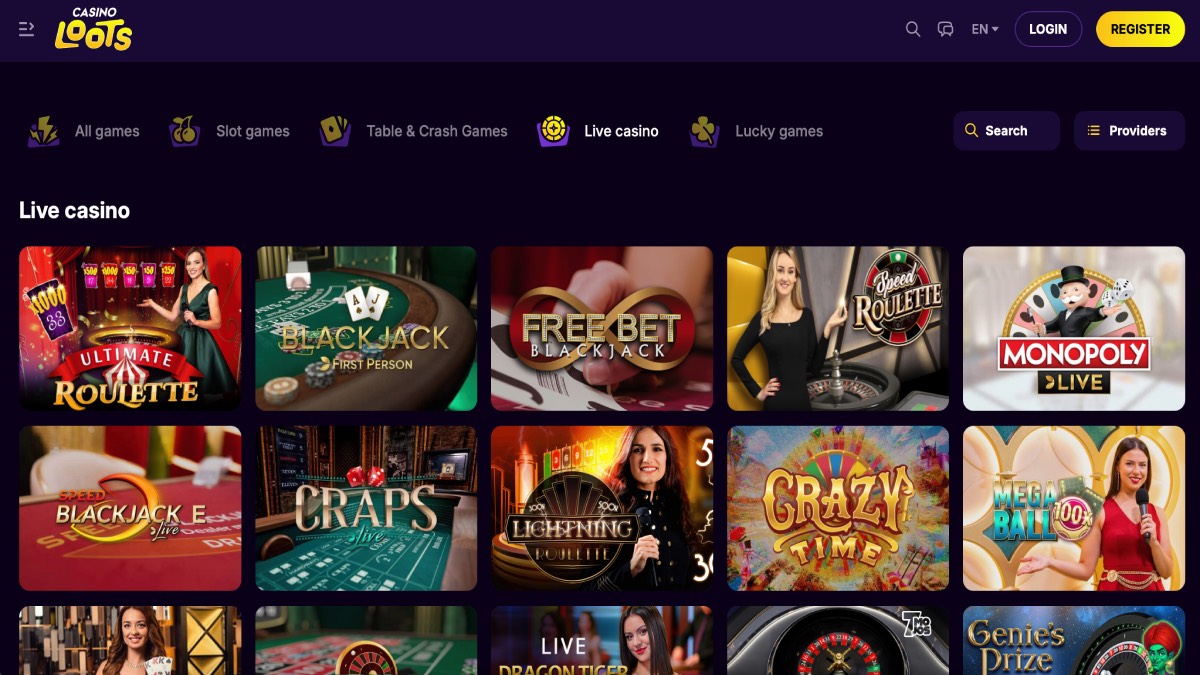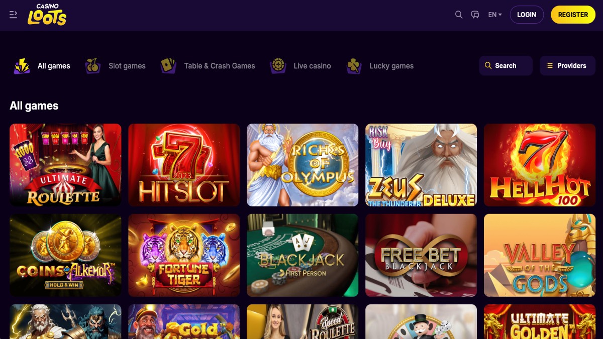 CasinoLoots offers a comprehensive gaming portfolio designed to cater to a wide range of players. The platform features over 4,000 slot titles, spanning classic, video, and themed options, alongside table games and fast-paced crash games for those seeking strategic or adrenaline-fueled experiences. Players can also explore more than 400 live dealer games, providing an immersive casino atmosphere from the comfort of home. In addition, CasinoLoots includes lucky games for casual entertainment, a fully integrated sportsbook, and live sports betting options, ensuring that both casino enthusiasts and sports fans find engaging experiences under one platform.