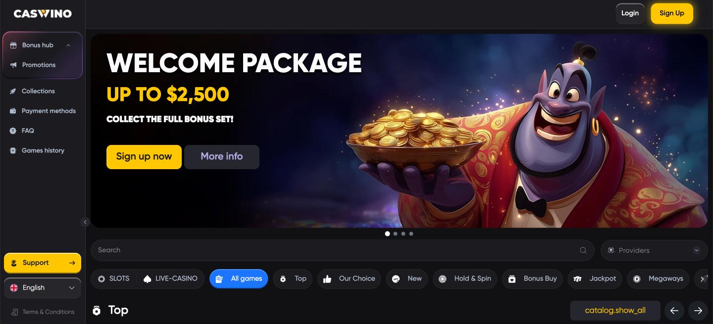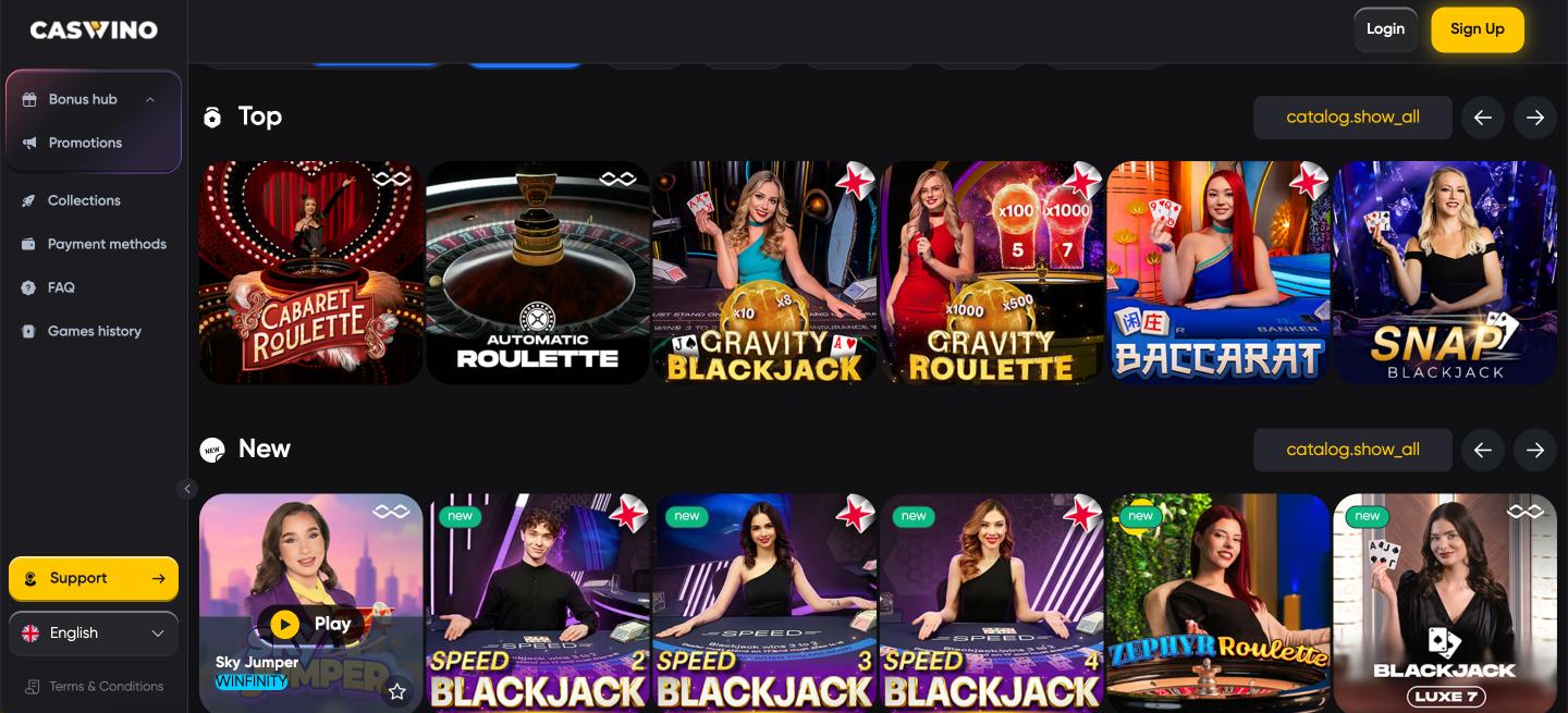 Caswino boasts a massive library of over 12,000 slot games alongside more than 1000+ live dealer tables. Categories are clearly organized into Megaways, Bonus Buy, instant-win games, and the latest releases, making it easy to discover new favorites. The predictive search tool finds games and providers instantly, while crash games and scratch cards have their own dedicated section. Fresh content from over 70 top studios arrives regularly, ensuring the selection never feels repetitive.