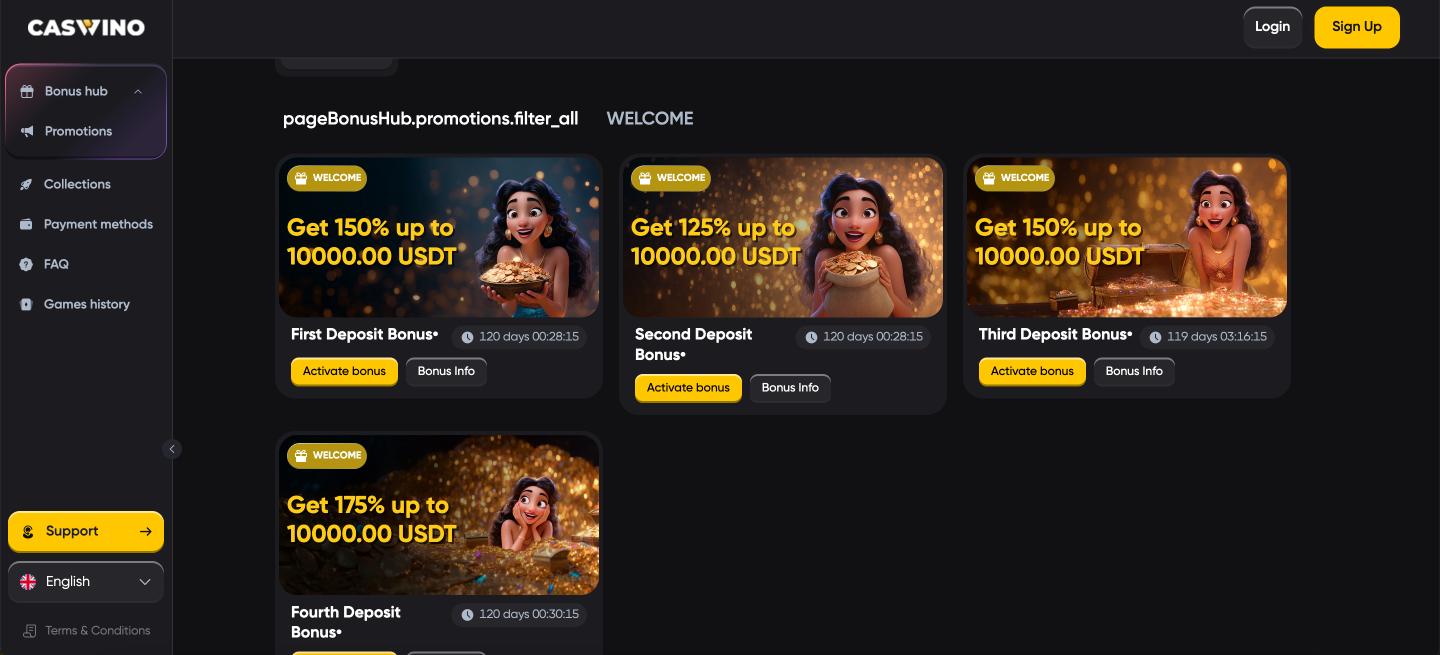 No bonus codes are required at Caswino Casino. The entire welcome package and all reload offers activate automatically when you make qualifying deposits through the cashier. Simply select the desired promotion in the bonus section before funding your account for instant activation.