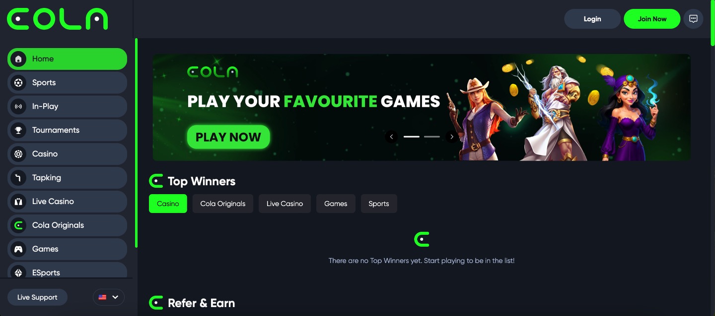 Cola Casino keeps the browser setup clean with slots leading, live dealer tables adding depth, and sportsbook covering events. Certified games deliver fair play. Crypto handles all transactions for speed and privacy. Support responds through contact channels. The interface directs players straight to casino or sports sections without clutter.