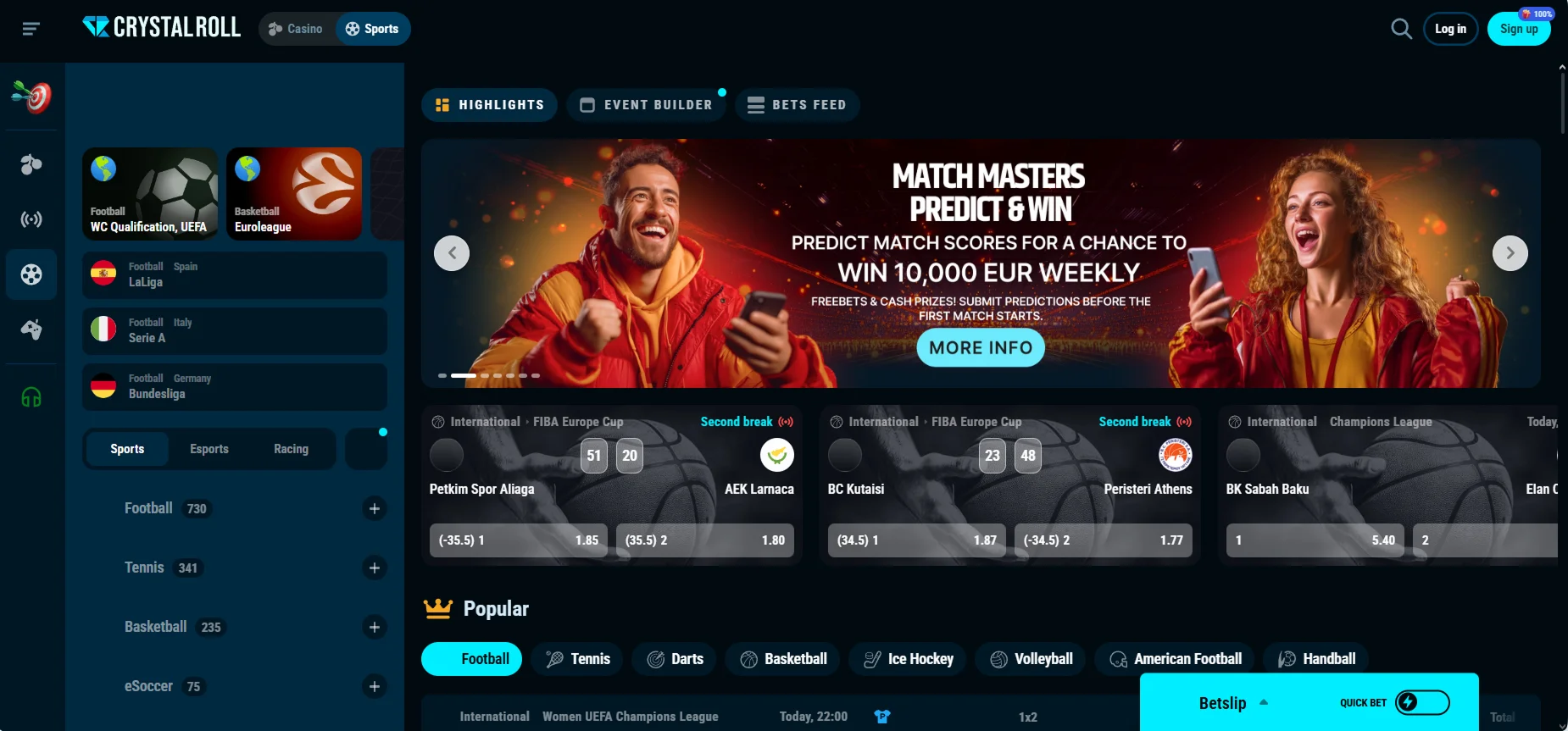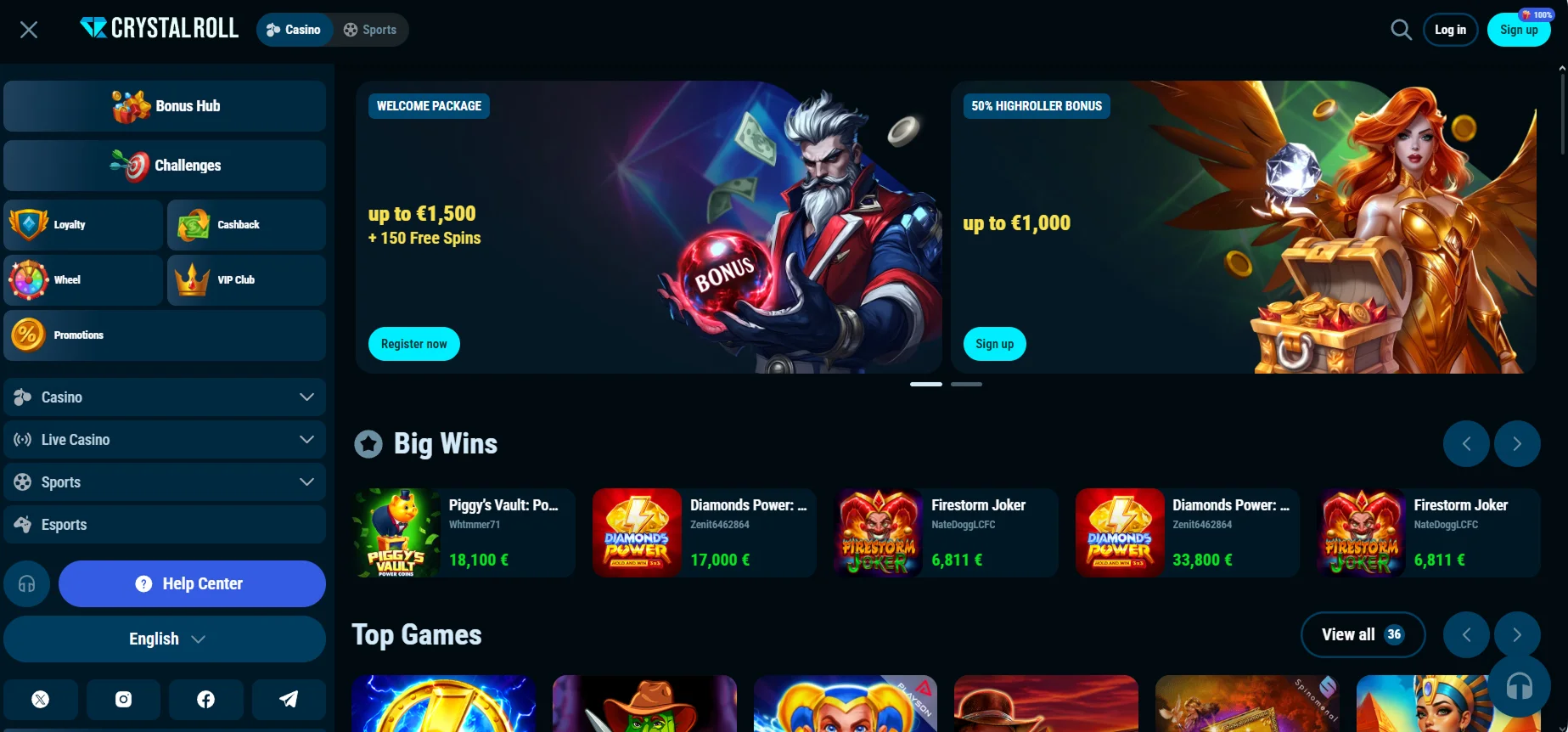 CrystalRoll Casino, launched in late 2024, combines over 6,000 casino games, including slots, live dealer tables, and crash titles—with a full sportsbook featuring cash-out and combo boosts. It offers a three-tier welcome package up to €2,500 plus 250 free spins for casino players (x35 wagering, 7-day validity), alongside weekly cashback to 25% and crypto-friendly banking. Licensed in Curacao with 24/7 support, the platform runs smoothly on desktop and mobile, though the €50 minimum withdrawal applies across all methods.
