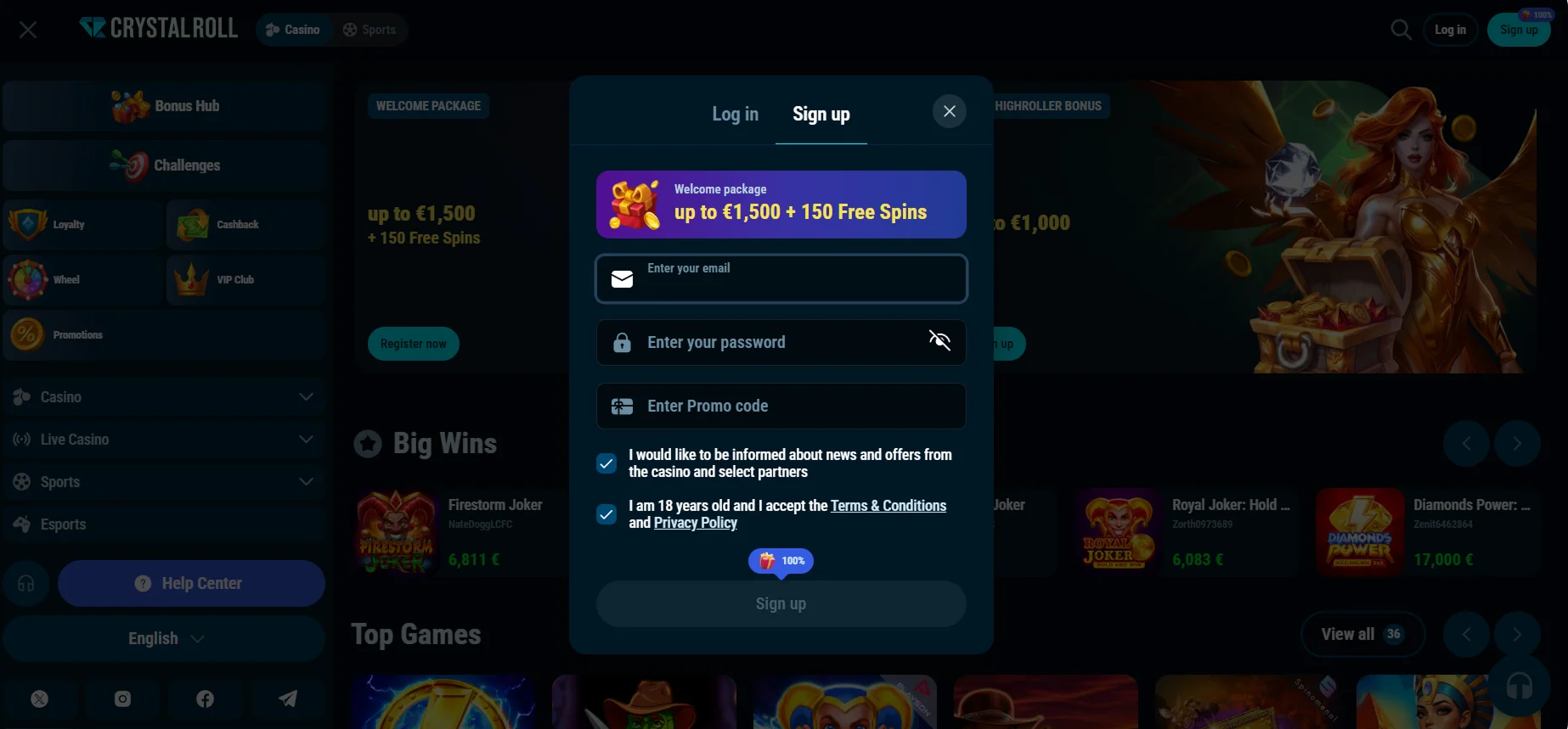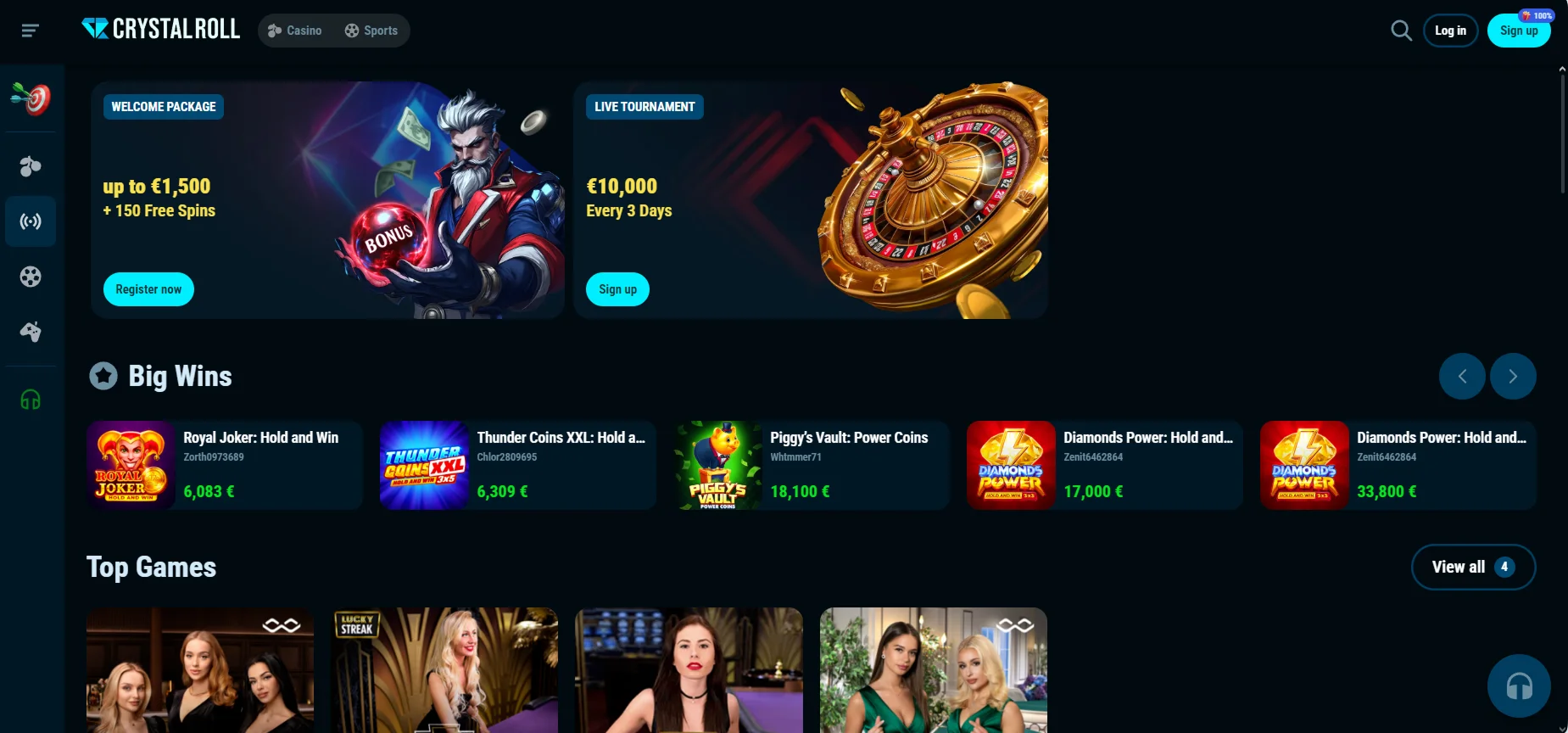 CrystalRoll Casino hosts more than 6,000 individual titles split between casino games and a sportsbook. The catalog covers standard slots, progressive jackpots, classic table games, crash titles, and over 1,000 live dealer tables. A dedicated sports section includes pre-match and in-play markets with features like cash-out, combo boost multipliers up to 1.5x, and weekly leaderboards. Navigation uses category filters and provider search, though availability varies by jurisdiction—certain studios and games remain blocked in specific countries as outlined in the terms.