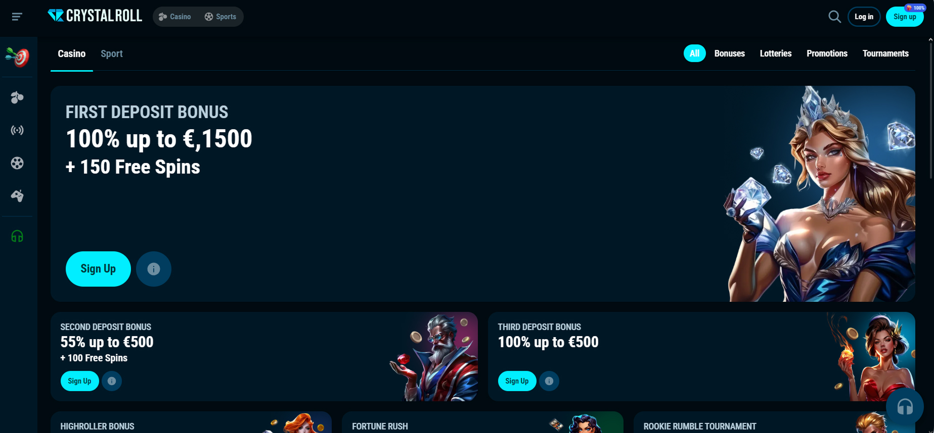 CrystalRoll Casino structures its initial offers across the first three deposits for casino play, while separate sports bonuses apply to betting accounts. The casino welcome package totals up to €2,500 in bonus funds plus 250 free spins, with each stage carrying a 7-day validity period and x35 wagering on the bonus amount only. Sports users receive up to €450 across three deposits with different percentages and the same wagering rules. Additional campaigns include weekly cashback reaching 25%, rakeback up to 17%, and multiple tournament prize pools ranging from daily €2,500 events to year-long competitions worth millions.