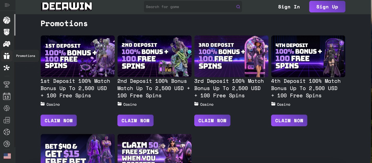DecaWin Casino offers a four-part welcome package that matches the first four deposits 100% up to 2,500 USD each, with 100 free spins added per deposit. The bonus is non-sticky, so players use real money first and can withdraw cash winnings anytime. Wagering is 30x on the bonus amount once activated. New members also get 50 free spins on registration. The sports section includes a risk-free first bet and a bet $40 get $15 free bet offer. A detailed VIP program provides cashback up to 20%, daily free spins, and level-up rewards. These offers keep the terms clear and player-friendly.