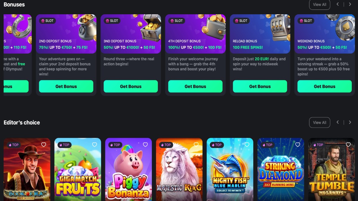1Interface/GamePlay Interface/GamePlayUser-friendly interface, interactive website, and bonus-based gameplay with generous welcome bonuses to attract new players and keep them interested in the platform. Bonuses allow gamblers to play for longer on their favorite casino games, to enjoy more thrilling betting sessions for free, with free spins and bonus money, and to land smashing real money wins without spending a dime on their side.