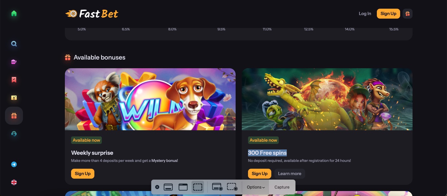 FastBet Casino provides several active promotions aimed at both new and returning players. Right after signing up, members can claim 300 free spins with no deposit needed, valid for 24 hours. Deposit offers include a 100% match up to €1000 and a 50% match up to €2000. A cashback system returns a portion of losses based on weekly activity, while the weekly surprise awards a mystery reward to anyone making more than four deposits in a week. These deals add extra value and keep gameplay interesting over time.