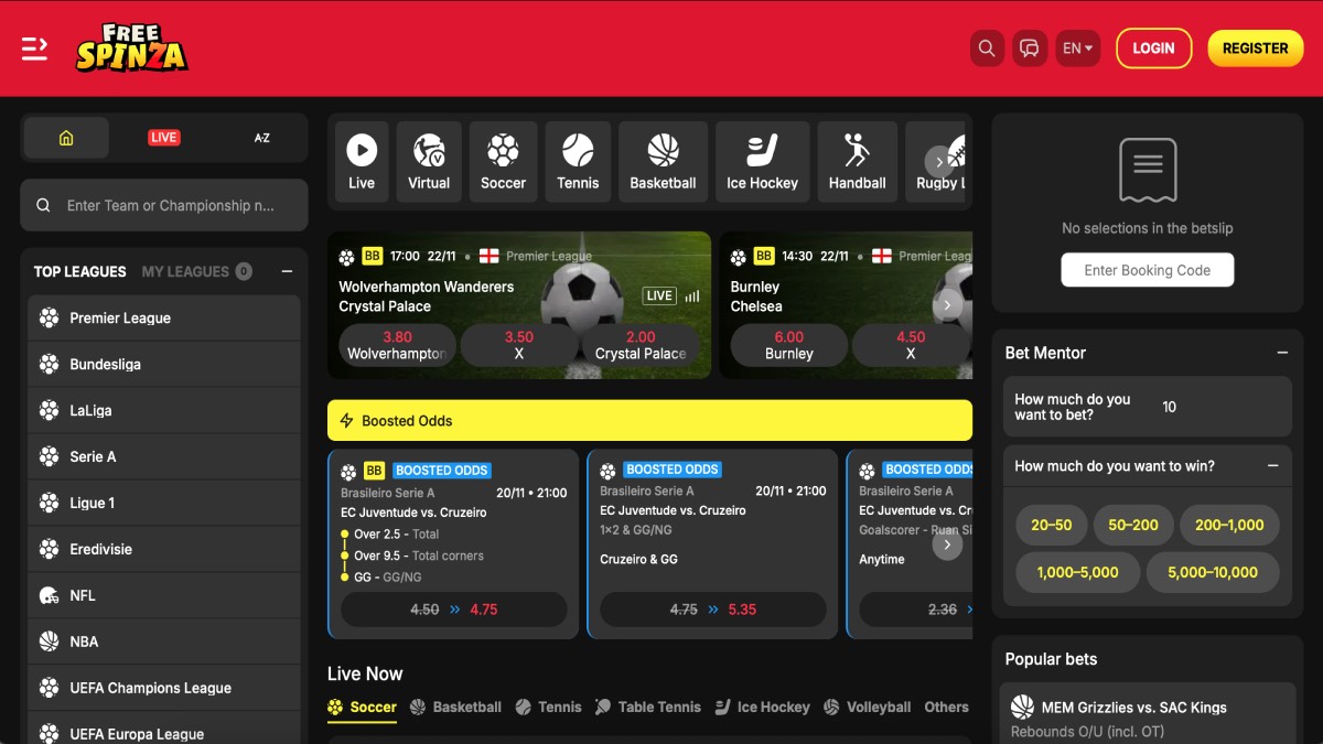 FreeSpinza Casino offers a wide range of bonuses and promotions that appeal to both casino and sports enthusiasts. New players can take advantage of a welcome bonus package totaling 305% up to €1,200, split across three deposits: 125% up to €400 on the first, 80% up to €600 on the second, and 100% up to €200 on the third. Regular promotions include a 150% reload bonus up to €250, a 25% Live Cashback on Tuesdays up to €500, and a 100% casino reload bonus on Wednesdays up to €200. Sports bettors are also rewarded with a 100% welcome sports bonus up to €100, a €25 welcome free bet, a 50% weekend reload bonus up to €100, and a 50% Tuesday sports reload up to €100, along with 0% margin betting options, providing consistent value for active players.