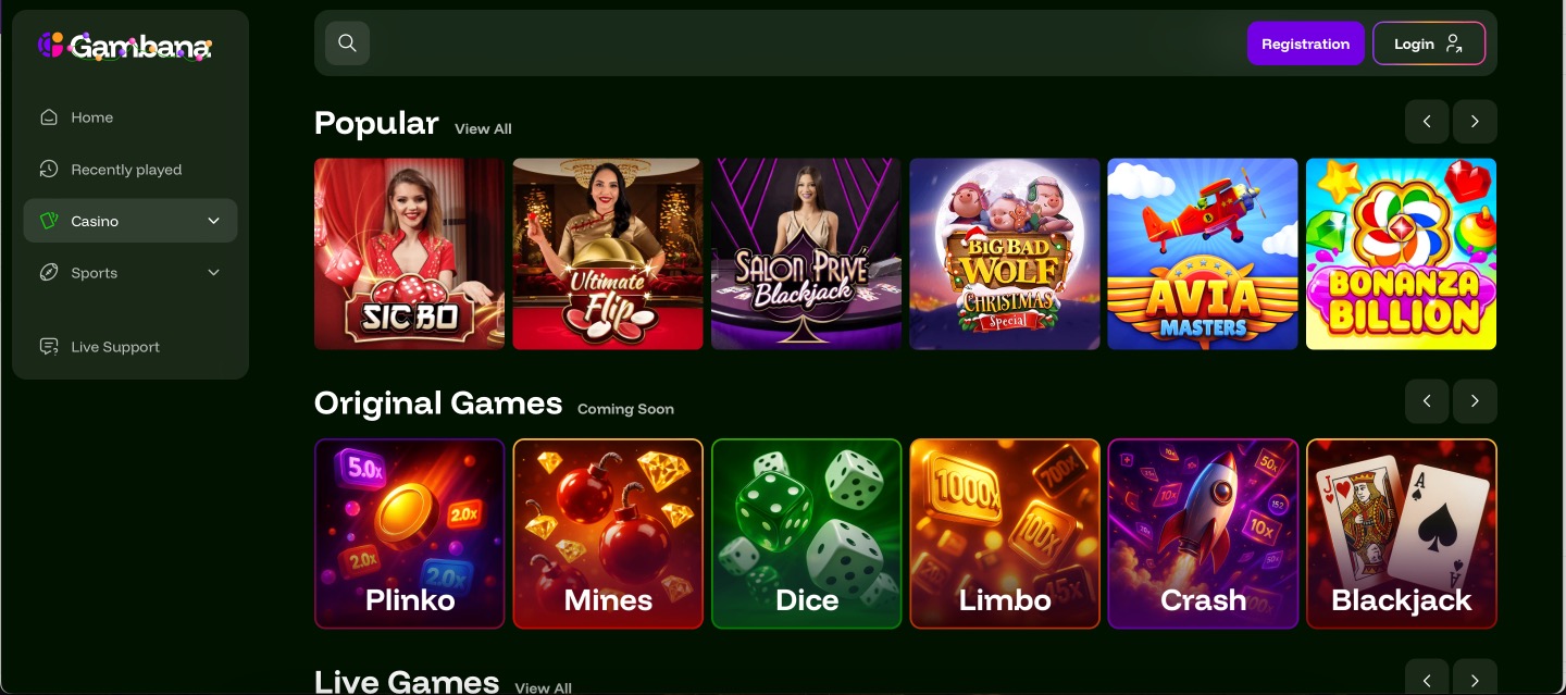 Operated by Middle Kang B.V. and licensed by the Curaçao Gaming Control Board, Gambana Casino meets basic regulatory requirements for offshore operations. The site provides a functional gaming environment, though certain features and offerings continue to evolve as the casino establishes itself.