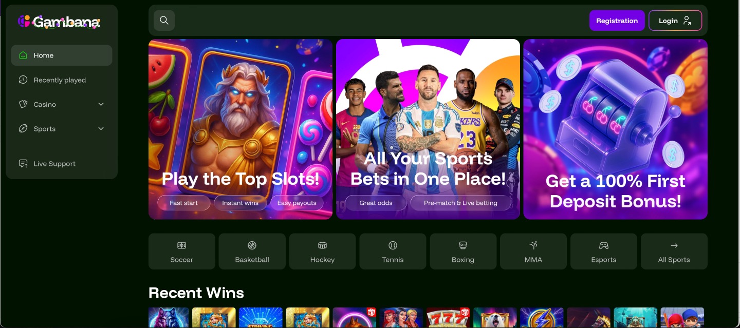 Gambana Casino is a cryptocurrency-focused online gaming site that launched toward the end of 2025. The platform combines a large casino section with a sportsbook, covering traditional sports, live events, and esports betting. Players can choose from thousands of slots, various table games, live dealer options, and additional categories like crash games and scratch cards. The site supports multiple languages and is built for browser-based access on both desktop and mobile devices.