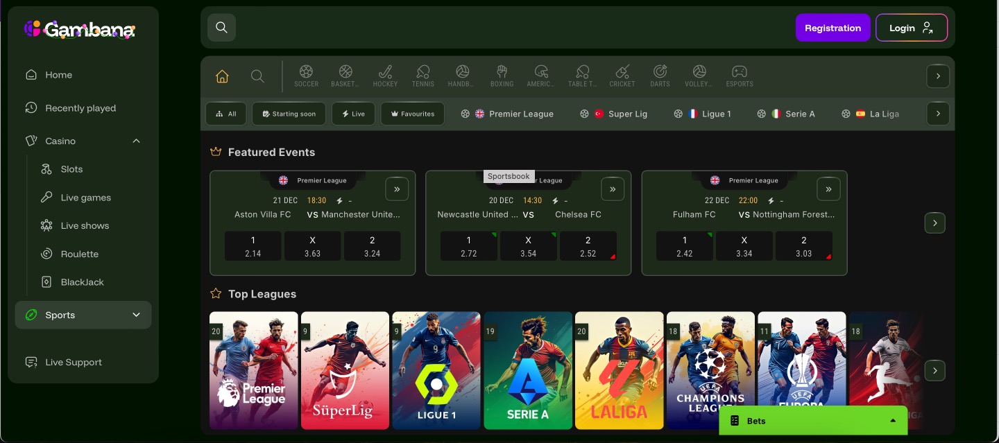 Yes, Gambana includes a sportsbook alongside the casino games. Players can place bets on pre-match and live events across various sports and esports tournaments using the same crypto-funded account.