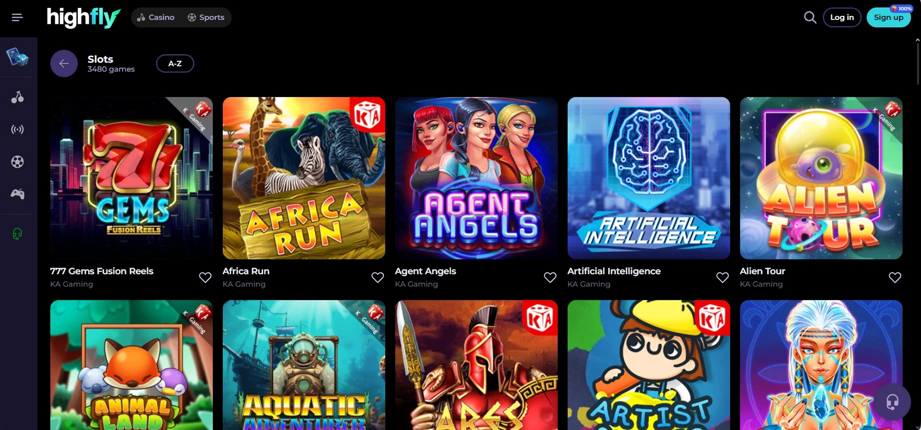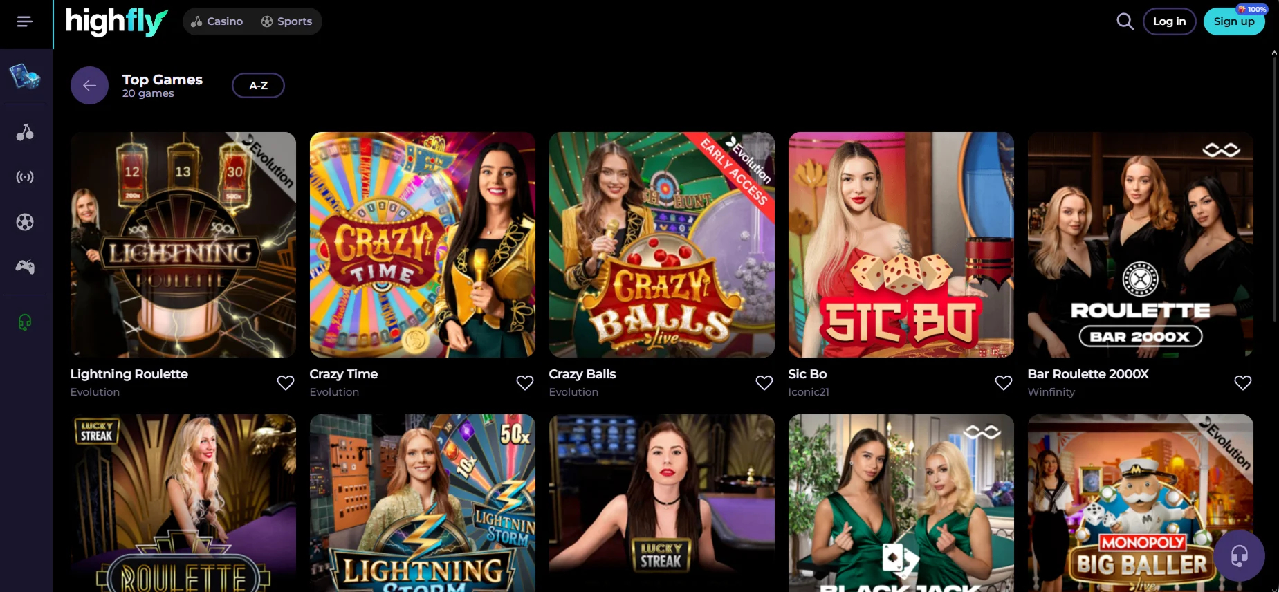 HighFlybet Casino maintains a library that exceeds 8,000 individual titles. The majority consists of video slots, but the catalog also contains a large number of crash games, instant-win scratch cards, jackpot releases, and classic table options. More than 2,000 live dealer tables run simultaneously, covering blackjack, roulette, baccarat, poker variants, and numerous game-show formats. Navigation relies on category filters and a provider list that includes most major studios currently active in the market.