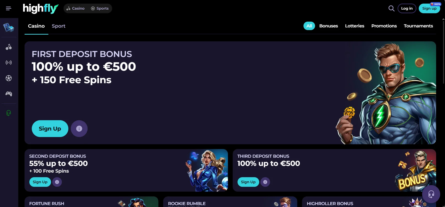 HighFlybet Casino runs an extended bonus program that starts with a three-stage welcome offer and continues with regular tournaments, cashback, and reload deals. New casino players receive a 100% match up to €500 plus 150 free spins on the first deposit, followed by 55% up to €500 and 100 free spins on the second, and another 100% up to €500 on the third. Sports bettors get a separate three-part package that reaches €450 in total across the first three deposits.