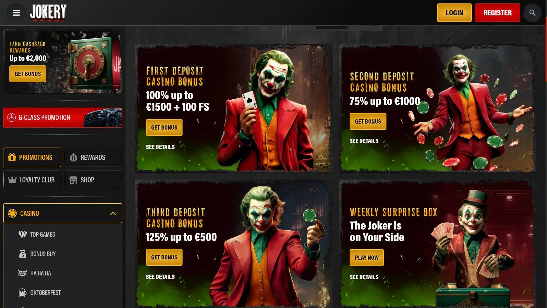 Jokery Casino structures its offers around a multi-tier welcome sequence for casino and sports, supplemented by ongoing deals like cashback and weekly reloads. The initial package spans three deposits, blending match bonuses with free spins for slots, while sports users get parallel boosts on odds-based wagers. Cashback kicks in from the first loyalty level, scaling with activity to return a portion of net losses as usable funds. Additional perks include daily missions, surprise boxes, and high-roller matches, though activation often ties to specific bet volumes or deposit thresholds. These elements provide steady value without overwhelming complexity, suiting players who track promotions methodically.
