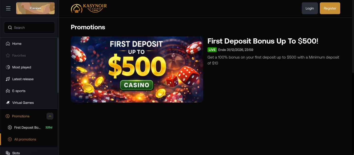 Kasynoir Casino centers its main reward on the first deposit with a 100% match up to $500. Minimum transfer stands at $10 to activate. Wagering requires 35 times the deposit amount before withdrawal. Additional offers include weekly surprise rewards after several deposits and cashback on losses. The platform covers sports betting markets alongside slots and live dealer tables. Support information remains limited on the site.