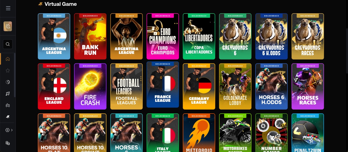 The platform covers sports betting markets, slots, and live dealer tables. Sections group options clearly.