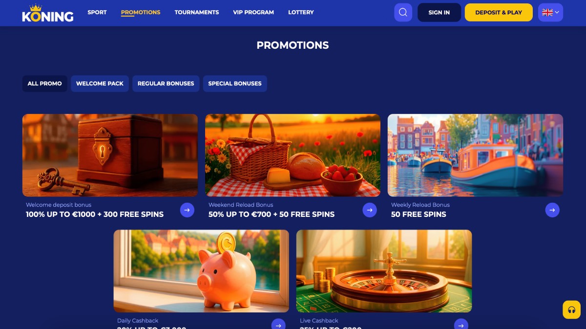 Koning Casino offers an appealing lineup of bonuses designed to reward both new and returning players with generous incentives. The welcome package stands out with a 100% match up to €1,000 and 300 free spins, making it a strong start for newcomers looking to explore the casino’s diverse game collection. Players can activate this offer using the promo code WELCOME, with a 35x wagering requirement. Regular players can also enjoy a steady stream of rewards through weekly and weekend reload offers, cashback programs, and free spins. The Weekend Reload Bonus grants a 50% bonus up to €700 and 50 free spins using the code FRIDAY, while the Weekly Reload Bonus provides 50 free spins with code WEEK and a 40x wagering requirement. Additionally, Koning Casino enhances player retention with two cashback promotions — a Daily Cashback of 20% up to €3,000 and a Live Casino Cashback of 25% up to €200. These offers collectively reflect the casino’s focus on maintaining player satisfaction through continuous engagement and flexible reward options.