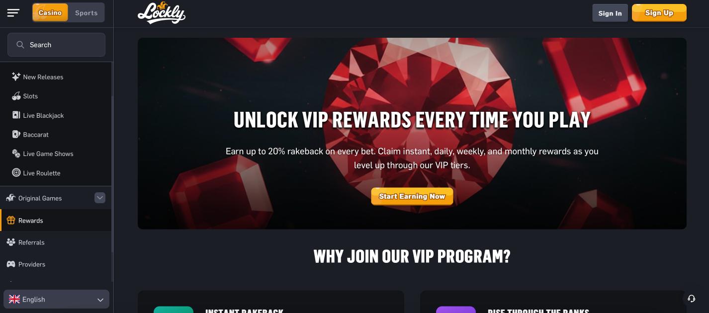 Lockly Casino centers its rewards around consistent returns rather than one-time packages. Every wager generates rakeback that players can claim instantly or hold for larger daily unlocks. Activity level determines the percentage returned, with higher engagement bringing better rates over time. Weekly and monthly bonuses supplement the base system for regular participants. No traditional deposit match appears on the site; instead the focus stays on ongoing play incentives through rakeback and timed claims. Original games and slots both contribute toward these rewards. The structure suits frequent users who prefer steady small returns instead of waiting for big sign-up offers. All bonuses tie directly to wagering volume with clear daily reset points.