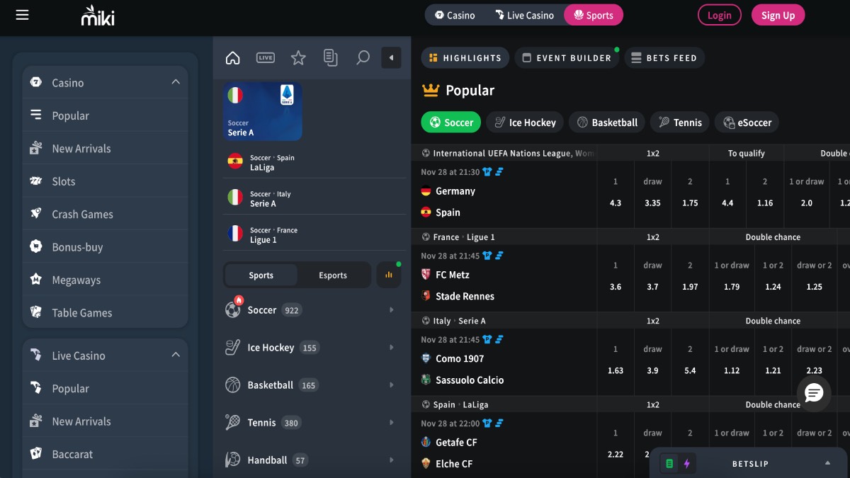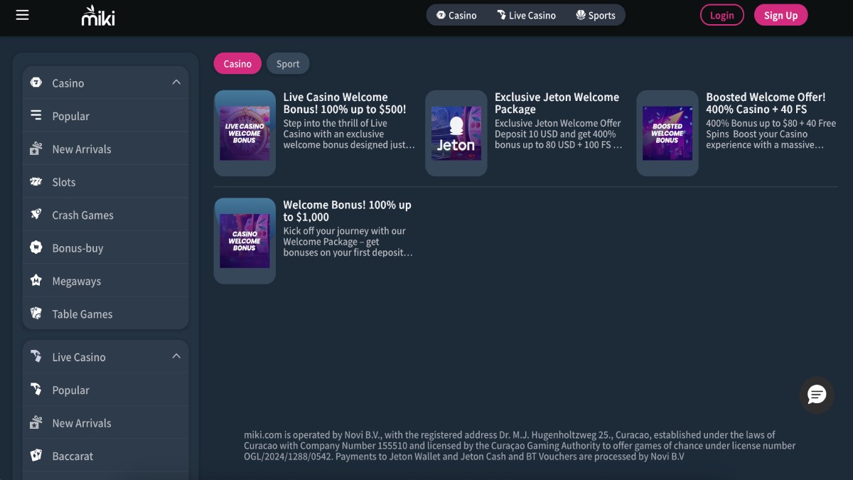 Miki Casino provides a diverse and engaging gaming experience, featuring over 5,000 slots, crash games, table games, and more than 500 live casino titles. Players can take advantage of multiple welcome bonuses, including a standard 100% match up to 1,000 EUR, a live casino bonus up to 500 EUR, and a boosted offer with a 400% match plus 40 free spins. The platform partners with top software providers such as NetEnt, Play’n GO, Evolution Gaming, Relax Gaming, Push Gaming, Big Time Gaming, and Nolimit City, ensuring high-quality gameplay. Secure and flexible payment options include major cards, PayPal, and instant bank transfers, with a mon...thly withdrawal limit of 100,000 USD. Licensed in Curacao and backed by responsive customer support, the casino combines safety, variety, and convenience for a reliable online gaming experience.