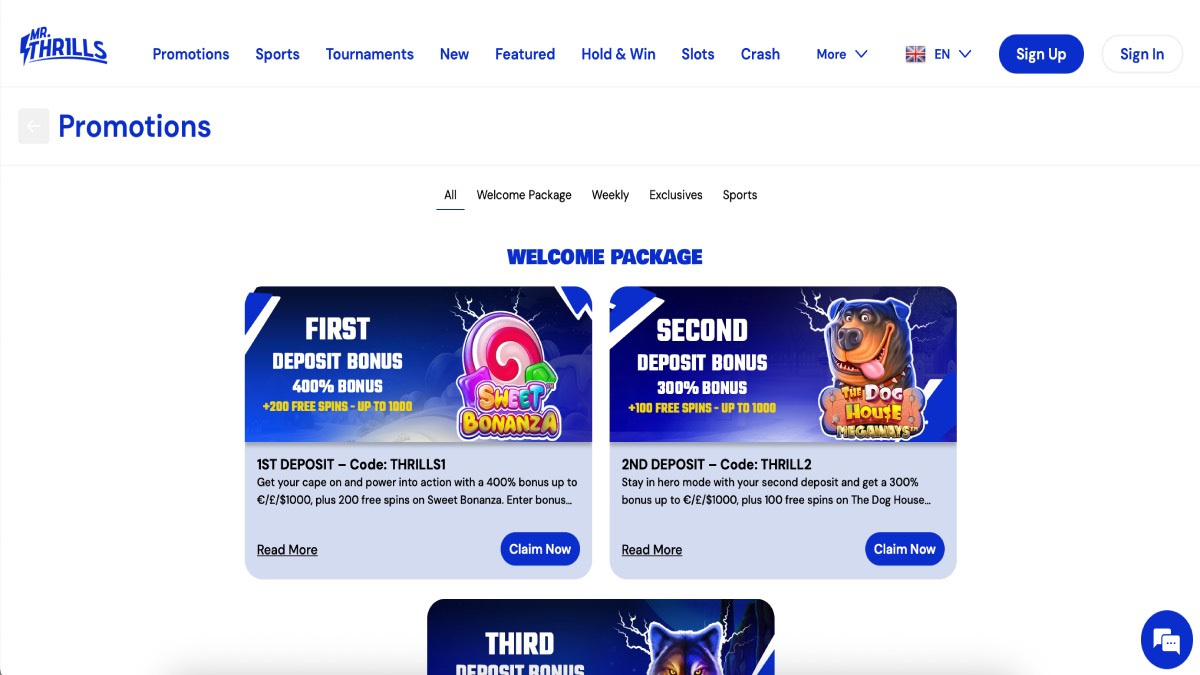 MrThrills Casino offers a diverse range of bonuses and promotions designed to appeal to both new and returning players. Newcomers can benefit from a generous three-step welcome package: the first deposit bonus provides a 400% match up to €1,000 along with 200 free spins using the code THRILLS1, followed by a 300% match up to €1,000 plus 100 free spins on the second deposit with THRILL2, and a 200% match up to €1,000 plus 50 free spins on the third deposit using THRILL3. Beyond the welcome offer, MrThrills keeps engagement high with ongoing promotions, including a Cashback Monday bonus, regular reload bonuses, and a Wednesday Boost to enhance mid-week play. Additionally, the casino provides exclusive bonuses for sports betting enthusiasts and VIP players, ensuring tailored rewards that cater to different gaming preferences. This structured and varied bonus system reflects MrThrills’ focus on rewarding both new arrivals and loyal players consistently.