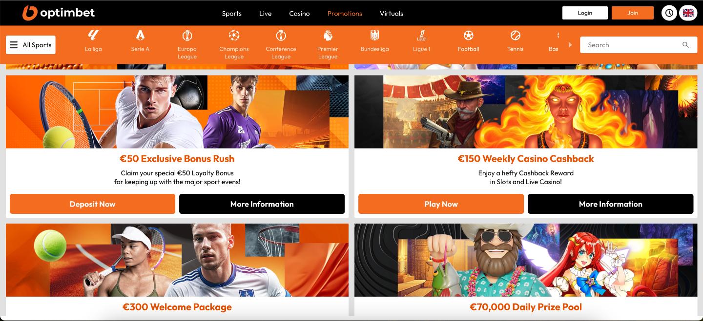 OptimBet Casino operates as a combined platform for casino games and sports betting, handling options for both types of players under one account. The site maintains a library that exceeds 5,000 titles, covering slots, table games, and a live dealer area with real-time tables. Separate sections exist for pre-match and in-play sports wagers, listing thousands of events each month across major leagues and lesser-known competitions.