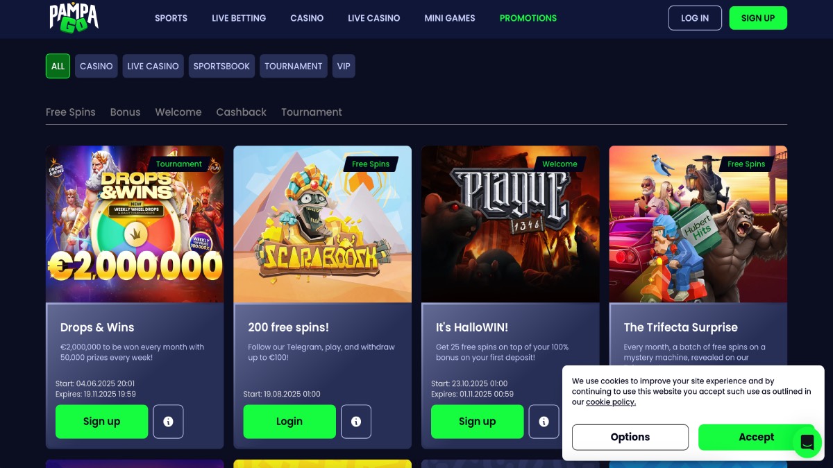 Yes. While the main promotions focus on deposit bonuses, PampaGo Casino also provides a 5% Live Casino Cashback up to €300. Free spins may be featured as part of seasonal or game-specific promotions, so players should check the promotions section regularly for the latest offers.