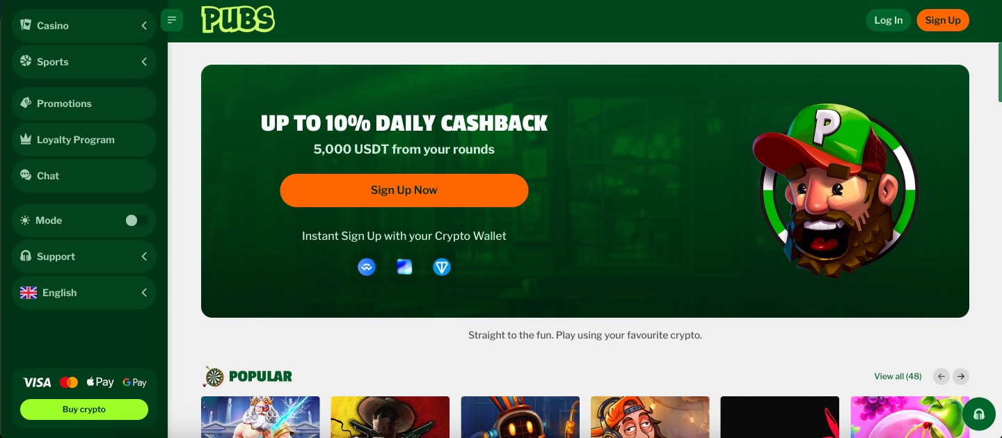 Pubs Casino operates as a crypto-focused platform that skips traditional welcome packages in favour of ongoing cashback rewards. Accounts open instantly through connected crypto wallets, letting players move straight into games or betting markets. The site covers slots, live dealer tables, and sports options under one balance. All transactions run on blockchain networks for direct processing.