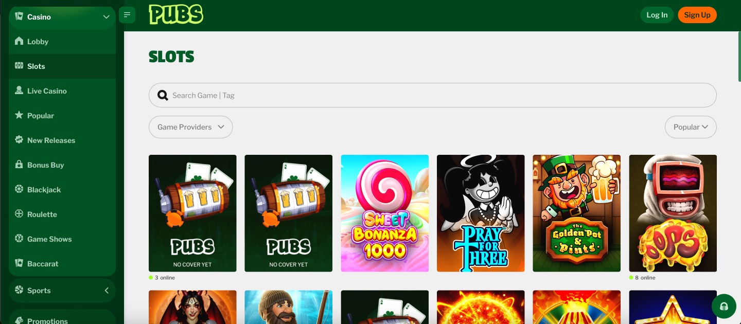 Pubs Casino stocks thousands of slots next to live dealer streams and sports betting lines. Filters sort by provider, popularity, or type for quick access. Releases cover classic formats and newer mechanics. Live tables run around the clock with standard rules.