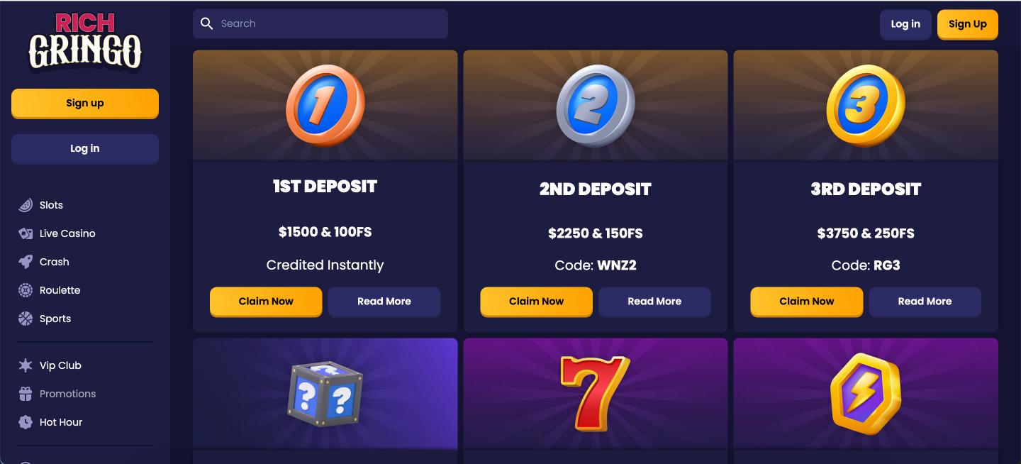 RichGringo Casino rolls out around 10 promotions geared toward various player preferences, covering sign-ups to regular sessions. First-time users pick from targeted welcome packages, including casino boosts or sports-related credits, each carrying specific conditions. The lineup addresses crypto holders, live table fans, and bettors on events, although certain promotions share comparable formats, which might make the total seem somewhat extended. A clear bonus guideline details qualifications, turnover needs, and how to activate them, aiming for straightforward use. Routine rewards encompass weekly reloads and loss rebates, with improved percentages linked to loyalty ranks. While these provide choices for ongoing activity, the rollover figures on select incentives, such as those for live sessions, tend to exceed typical levels, and caps on loyalty perks reduce their potential. The site adds a point-based system where completing challenges grants credits for additional plays or tokens, creating a layer of progression beyond standard ranks.