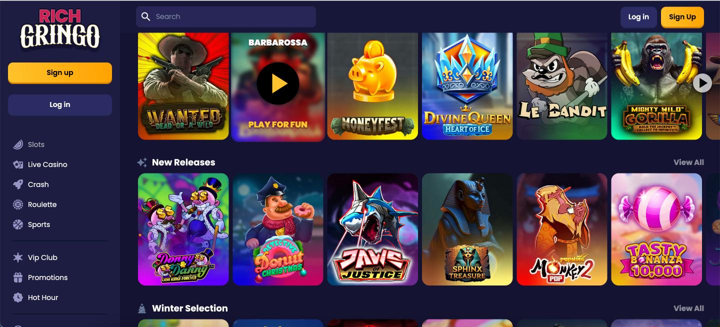 RichGringo Casino holds a collection surpassing 5,000 entries, encompassing slots, table formats, live interactions, and instant-win styles, with sorting tools by creators and categories to simplify browsing. The mix focuses on quantity alongside organization, though access to some games depends on user location. Slots form the bulk, ranging from basic setups to those with expanding grids, as table selections provide automated and hosted versions. Live sections feature familiar games and interactive variants, while quick-play options suit shorter sessions. The sportsbook covers over 30 areas, including major competitions and virtual sports, enabling transitions between casino and wagering. Reliability stems from more than 50 creators, offering steady return rates and device adaptability, but limited trial modes for certain games restrict previews. Additions like instant lotteries address needs for rapid outcomes, resulting in a practical assortment that fits multiple styles and bet sizes.
