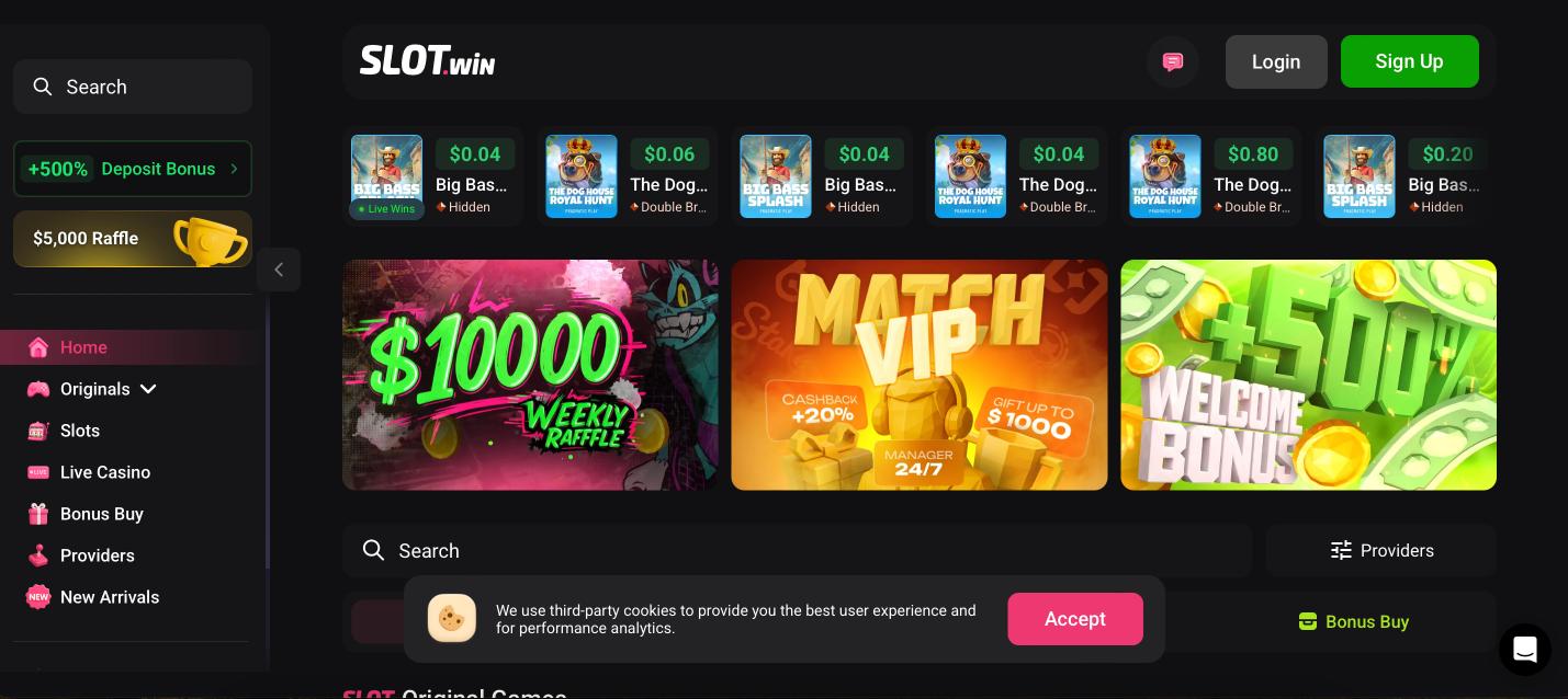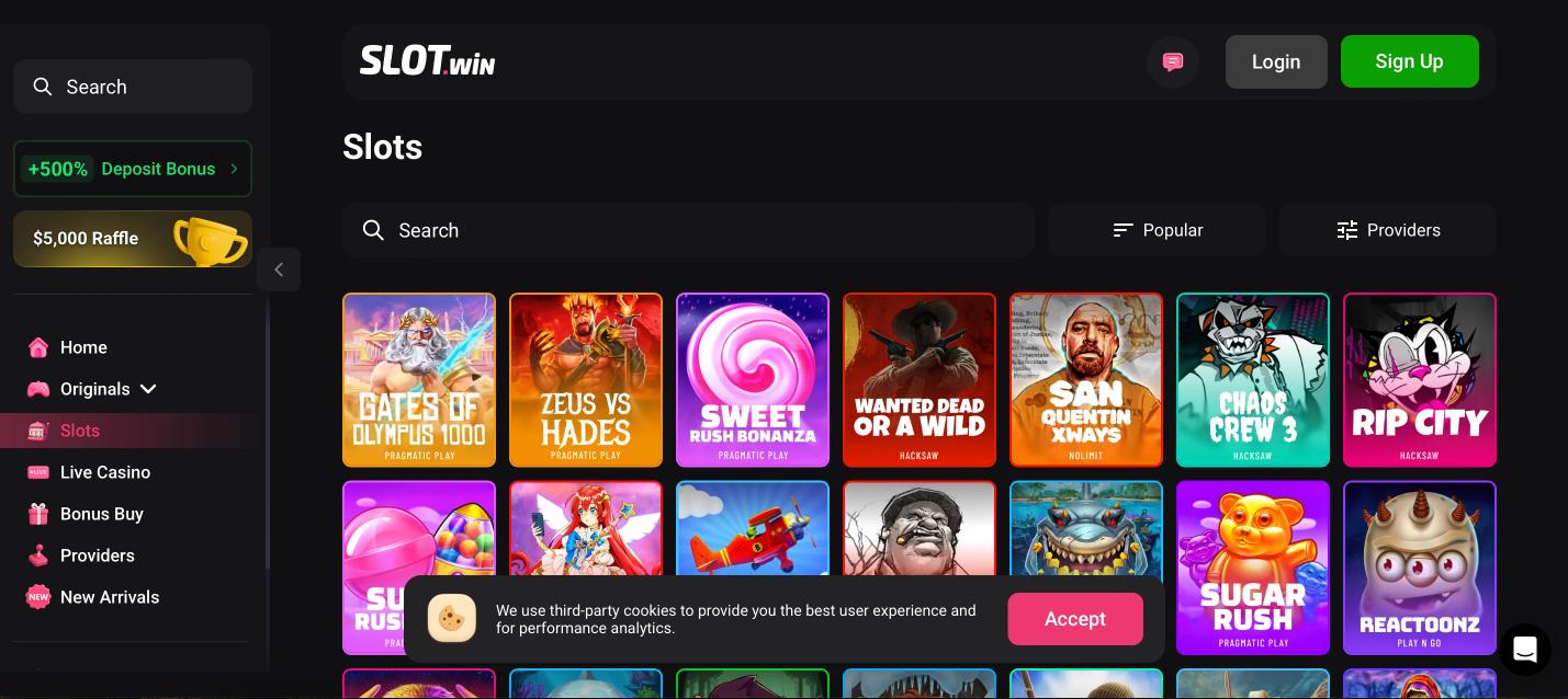 SlotWin Casino is a straightforward online gaming site with a focused selection of casino games and a clear emphasis on cryptocurrency transactions. The platform keeps things simple, offering slots, a modest live casino area, and a few in-house originals. There is no sports betting section, so the entire catalog is dedicated to traditional casino play.