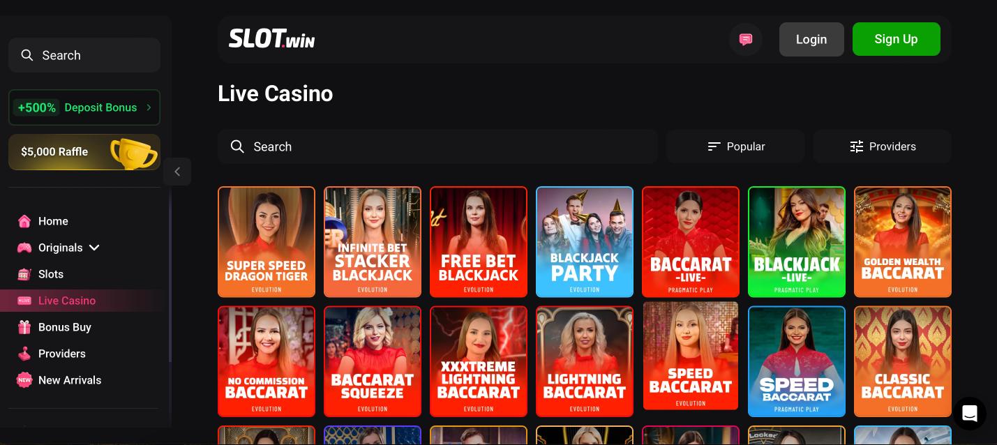SlotWin Casino maintains a library of just over 1,000 games, which is smaller than many competing sites but still includes a reasonable mix of popular titles. The catalog is split into slots, live dealer tables, and a small set of SlotWin Originals. There is no sportsbook or separate poker section, so the focus stays entirely on casino-style games.