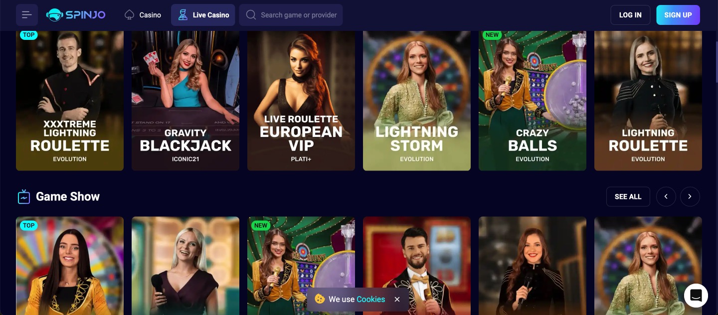 Spinjo Casino assembles thousands of games, led by slots in formats like Megaways, hold & win, jackpots, and bonus buy features. Categories organize new releases, recommended picks, and themes such as mythology or classics. Live dealer tables cover blackjack, roulette, baccarat, plus shows like Crazy Time. RNG tables include video poker and card variants, with instant wins offering crash, mines, and plinko. Providers exceed 100, ensuring steady quality and mobile play. Filters help narrow choices by volatility or mechanic, though demos vary and geo-restrictions affect access in places. No sportsbook section exists, keeping focus on casino content. The arrangement supports casual spins or focused sessions across stakes.
