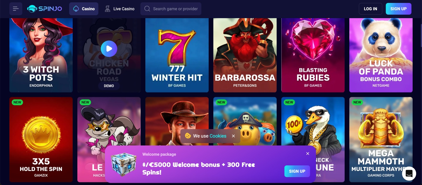 Spinjo Casino launched in 2024 and centers on a solid lineup of online slots, RNG tables, live dealer action, and quick instant games. The collection reaches thousands of titles, with strong emphasis on slots featuring Megaways, jackpots, bonus buys, and themed groups like books or fruits. Live sections bring dealer-led roulette, blackjack, and game shows, while instant wins add crash and plinko-style options. The site runs smoothly on desktops, tablets, and phones with responsive design, though no standalone app exists. Curacao licensing through Hollycorn N.V. provides operational oversight, alongside SSL protection for data. Payments mix fiat cards/e-wallets with various cryptocurrencies, starting from low minimums around €20. Regional availability can limit some games or methods, so checking during signup matters. The platform balances quantity and organization, fitting players who want variety across different formats without added betting sections.