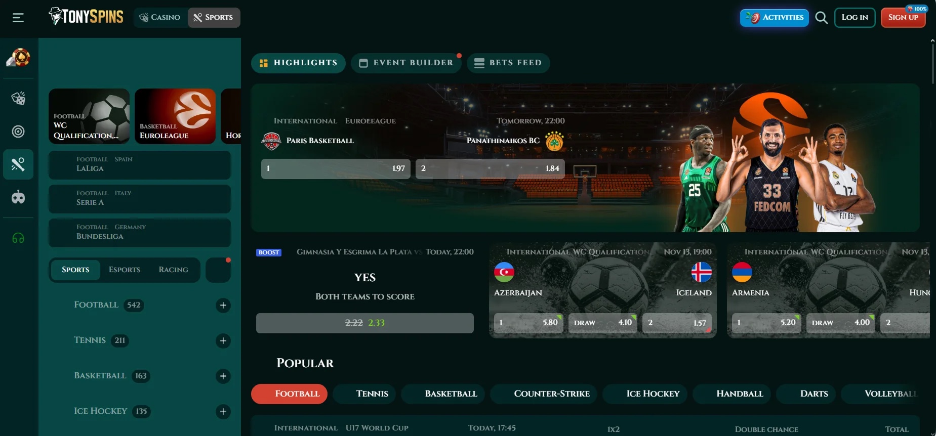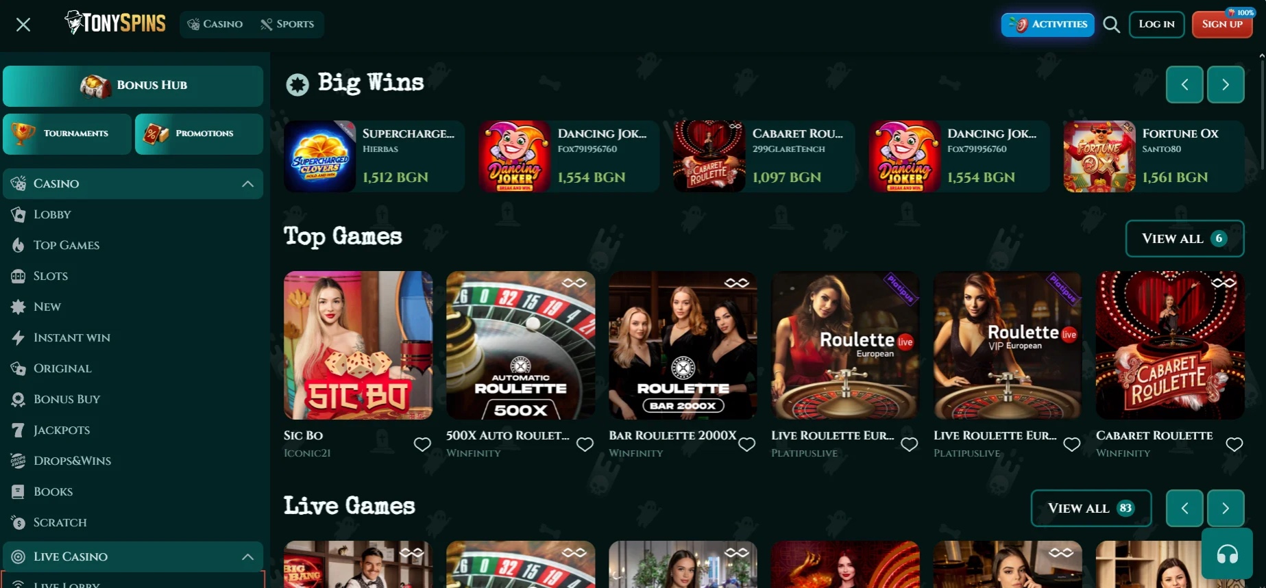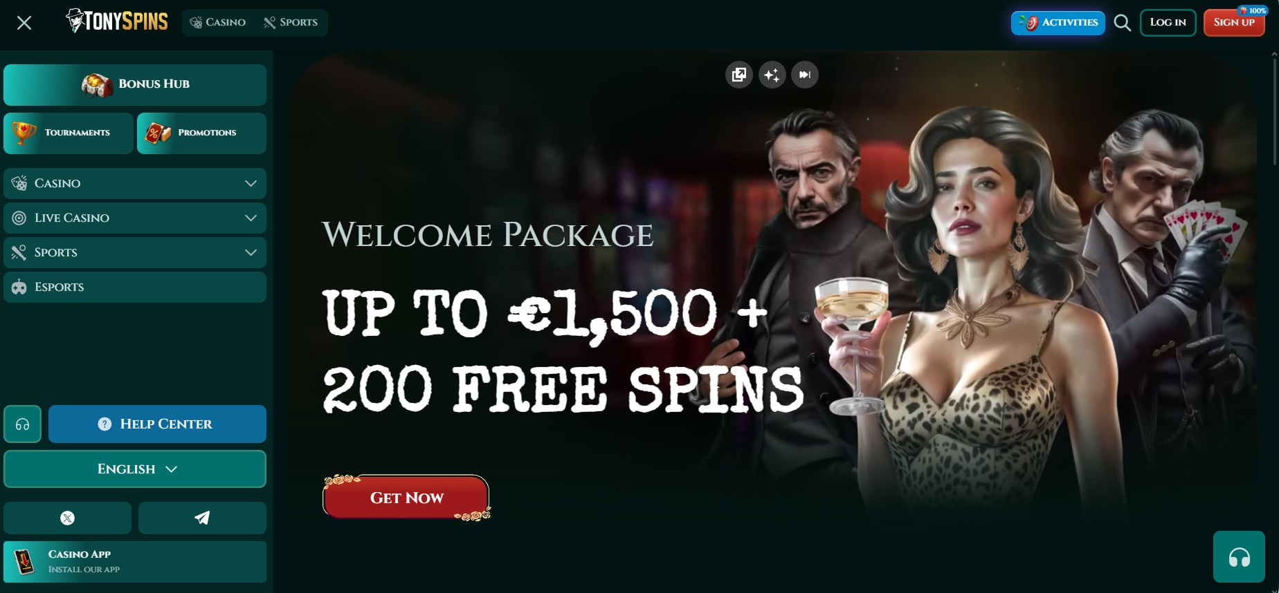 TonySpins Casino combines a full-scale online casino with an integrated sportsbook, delivering over 6,000 slot titles, more than 200 live dealer tables, and betting markets that span major leagues, niche competitions, and in-play events. The platform accepts EUR as its base currency while supporting cryptocurrency transactions, processes withdrawals within zero to three days, while banking includes cards, e-wallets, prepaid vouchers, and multiple coins, with minimum deposits and withdrawals starting at €20. Customer support runs 24/7 via live chat and email, the site performs reliably on desktop and mobile browsers without a ptoblem, but... the casino also has an app.